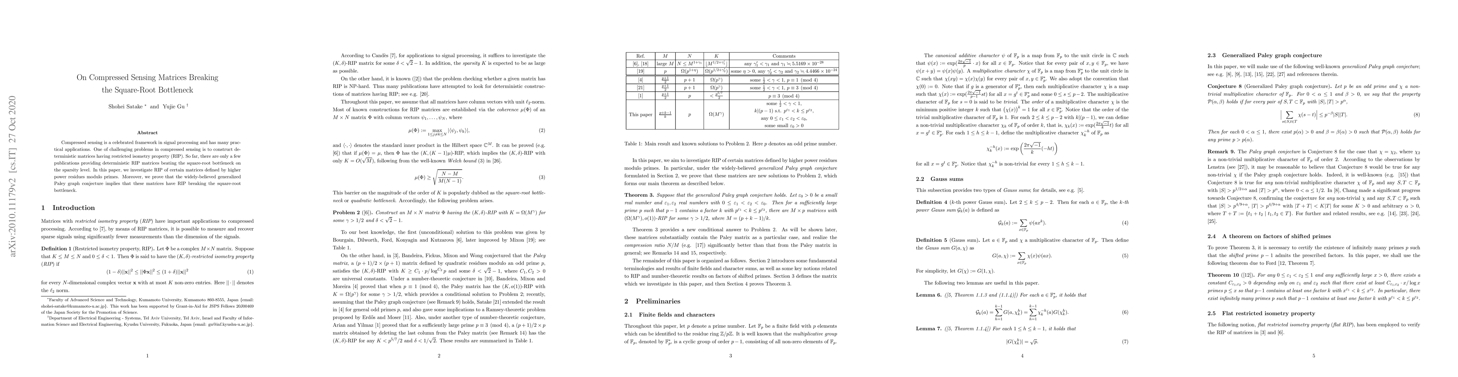 This paper explores deterministic matrices with restricted isometry property (RIP) that exceed the traditional square-root bottleneck in compressed sensing. It proposes matrices based on higher power residues modulo primes and demonstrates that these matrices achieve RIP beyond the conventional sparsity limit, supported by the generalized Paley graph conjecture.