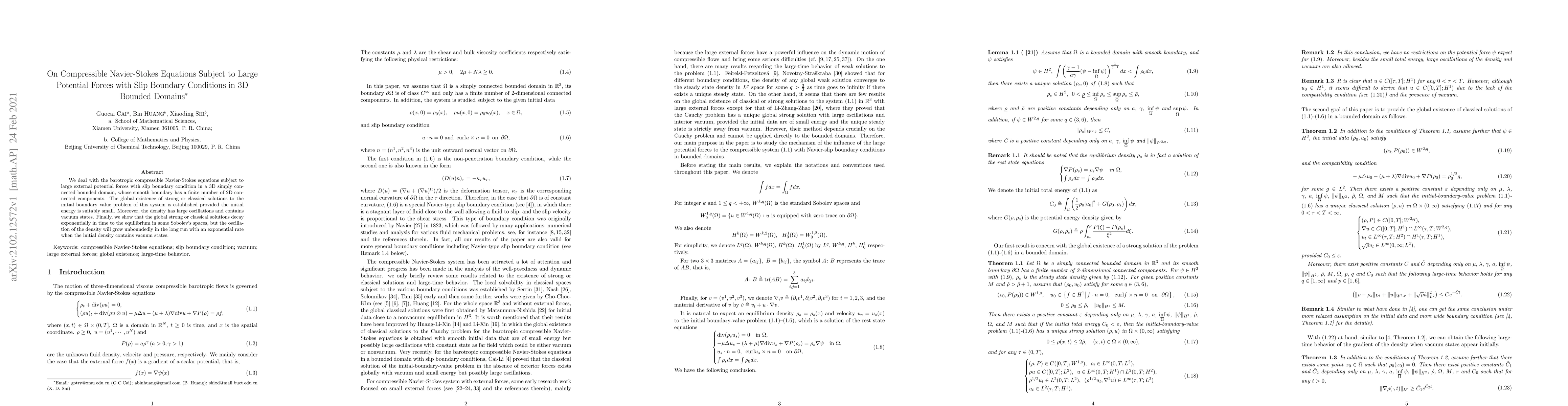 We deal with the barotropic compressible Navier-Stokes equations subject to large external potential forces with slip boundary condition in a 3D simply connected bounded domain, whose smooth boundary has a finite number of 2D connected components. The global existence of strong or classical solutions to the initial boundary value problem of this system is established provided the initial energy is suitably small. Moreover, the density has large oscillations and contains vacuum states. Finally, we show that the global strong or classical solutions decay exponentially in time to the equilibrium in some Sobolev's spaces, but the oscillation of the density will grow unboundedly in the long run with an exponential rate when the initial density contains vacuum states.