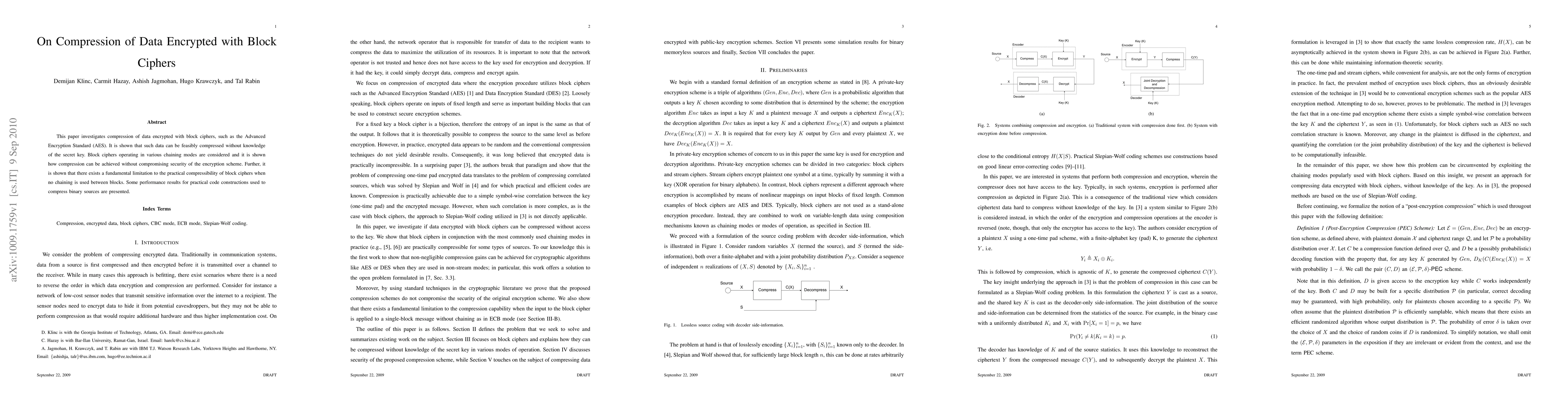 This paper explores the feasibility of compressing data encrypted with block ciphers like AES without requiring the secret key, demonstrating secure compression methods across various chaining modes. It also identifies a fundamental limit to compressibility when no chaining is used and presents performance results for practical compression techniques.