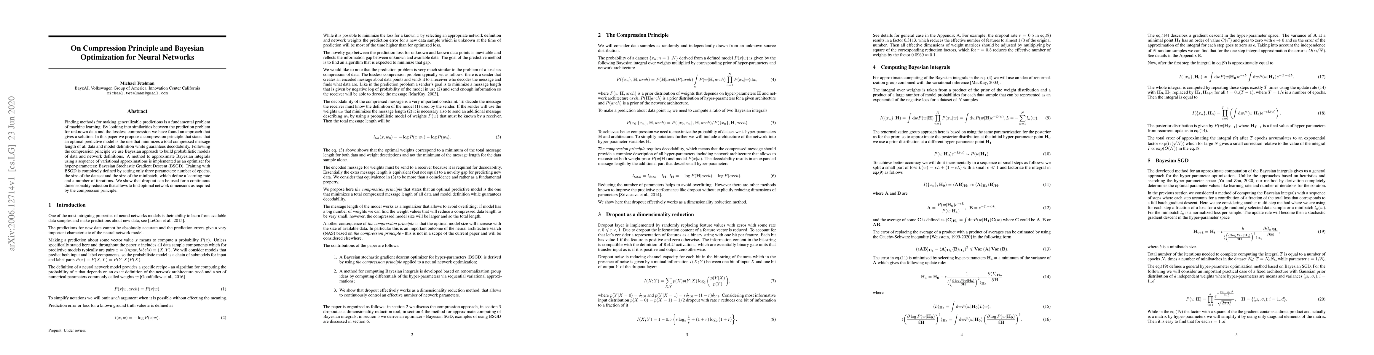 Finding methods for making generalizable predictions is a fundamental problem of machine learning. By looking into similarities between the prediction problem for unknown data and the lossless compression we have found an approach that gives a solution. In this paper we propose a compression principle that states that an optimal predictive model is the one that minimizes a total compressed message length of all data and model definition while guarantees decodability. Following the compression principle we use Bayesian approach to build probabilistic models of data and network definitions. A method to approximate Bayesian integrals using a sequence of variational approximations is implemented as an optimizer for hyper-parameters: Bayesian Stochastic Gradient Descent (BSGD). Training with BSGD is completely defined by setting only three parameters: number of epochs, the size of the dataset and the size of the minibatch, which define a learning rate and a number of iterations. We show that dropout can be used for a continuous dimensionality reduction that allows to find optimal network dimensions as required by the compression principle.