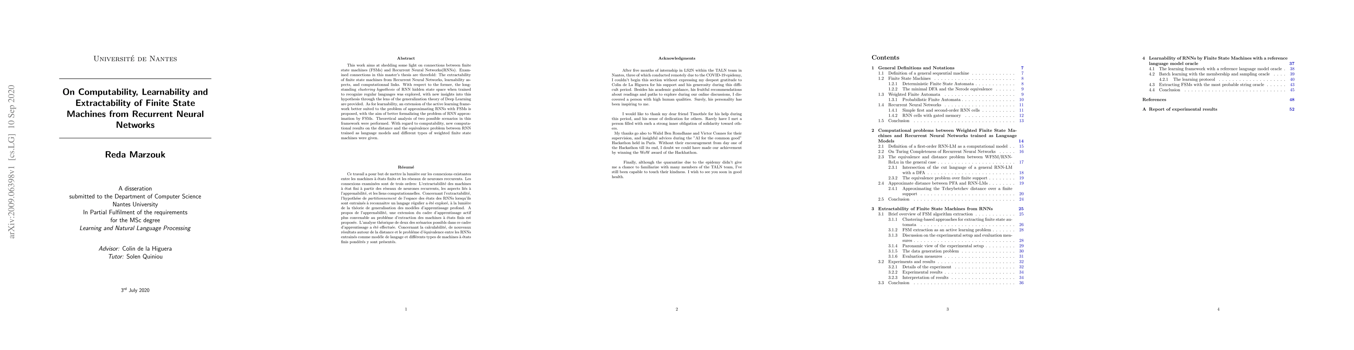 This work aims at shedding some light on connections between finite state machines (FSMs), and recurrent neural networks (RNNs). Examined connections in this master's thesis is threefold: the extractability of finite state machines from recurrent neural networks, learnability aspects and computationnal links. With respect to the former, the long-standing clustering hypothesis of RNN hidden state space when trained to recognize regular languages was explored, and new insights into this hypothesis through the lens of recent advances of the generalization theory of Deep Learning are provided. As for learnability, an extension of the active learning framework better suited to the problem of approximating RNNs with FSMs is proposed, with the aim of better formalizing the problem of RNN approximation by FSMs. Theoretical analysis of two possible scenarions in this framework were performed. With regard to computability, new computational results on the distance and the equivalence problem between RNNs trained as language models and different types of weighted finite state machines were given.