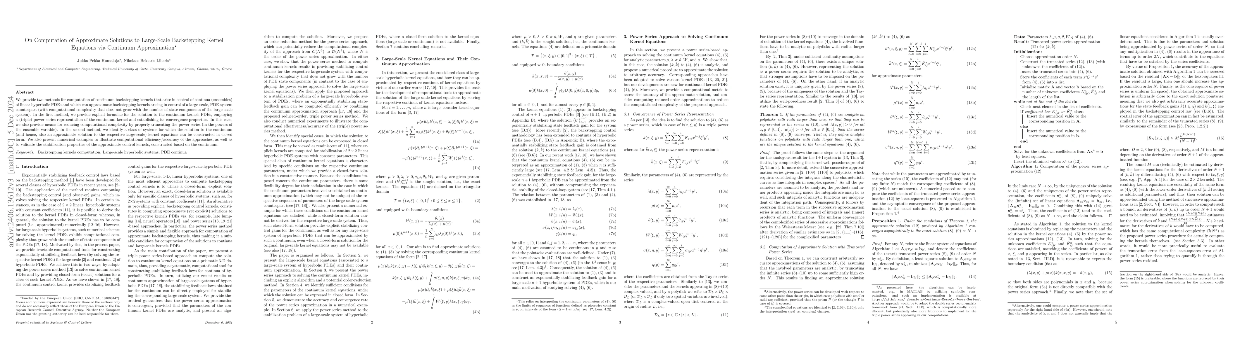 We provide two methods for computation of continuum backstepping kernels that arise in control of continua (ensembles) of linear hyperbolic PDEs and which can approximate backstepping kernels arising in control of a large-scale, PDE system counterpart (with computational complexity that does not grow with the number of state components of the large-scale system). In the first method, we identify a class of systems for which the solution to the continuum (and hence, also an approximate solution to the respective large-scale) kernel equations can be constructed in closed form. In the second method, we provide explicit formulae for the solution to the continuum kernels PDEs, employing a (triple) power series representation of the continuum kernel and establishing its convergence properties. In this case, we also provide means for reducing computational complexity by properly truncating the power series (in the powers of the ensemble variable). We also present numerical examples to illustrate computational efficiency/accuracy of the approaches, as well as to validate the stabilization properties of the approximate control kernels, constructed based on the continuum.