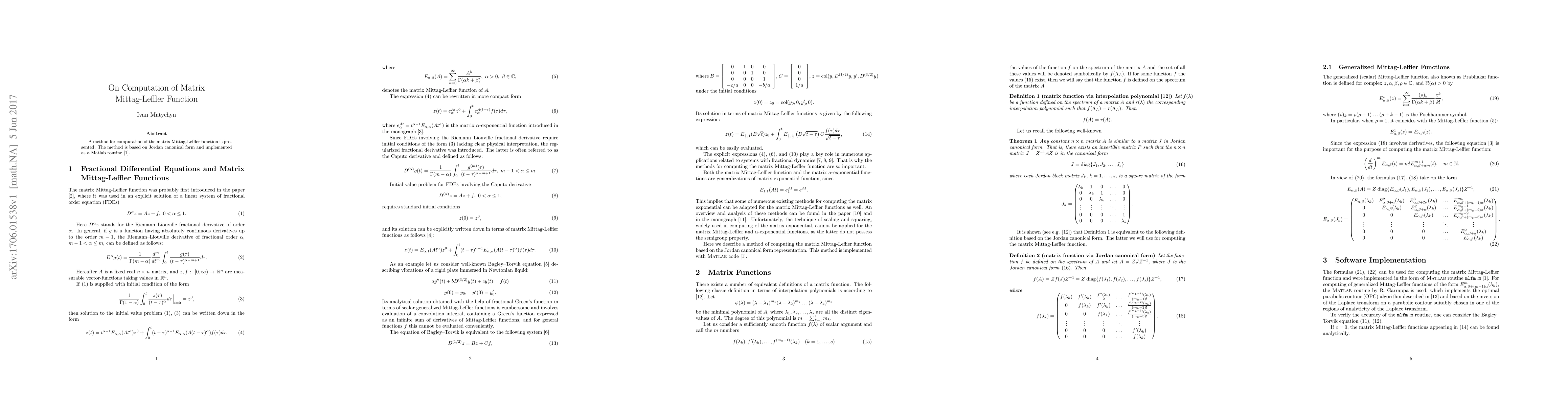 Summary: This paper introduces a computational method for the matrix Mittag-Leffler function, utilizing the Jordan canonical form, and provides a Matlab implementation for practical application.