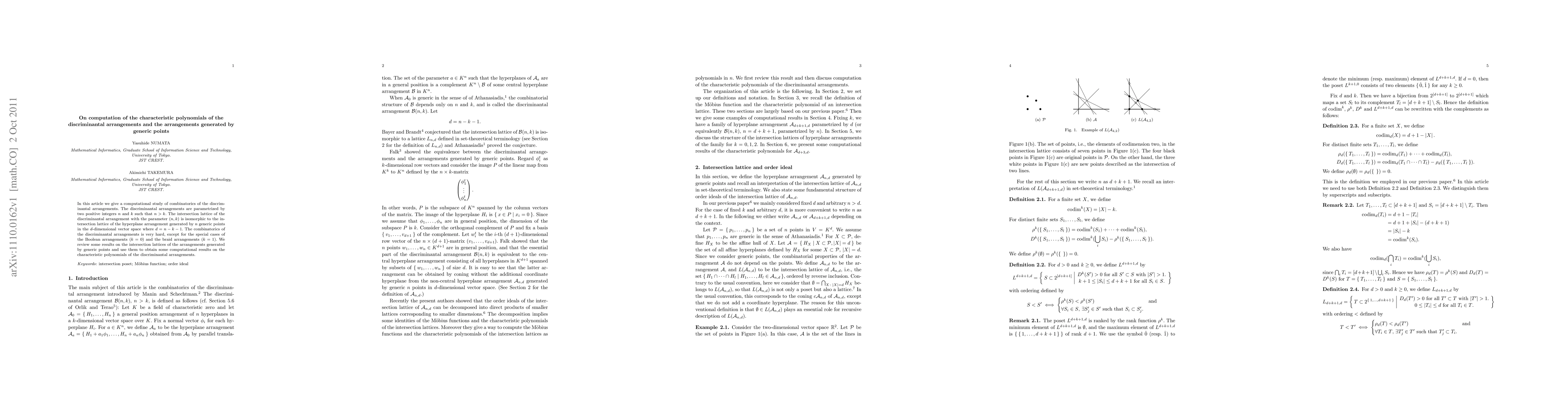 This paper presents a computational study of the combinatorics of discriminantal arrangements, focusing on their intersection lattices and characteristic polynomials. It establishes a connection between these arrangements and hyperplane arrangements generated by generic points, providing results for their characteristic polynomials.