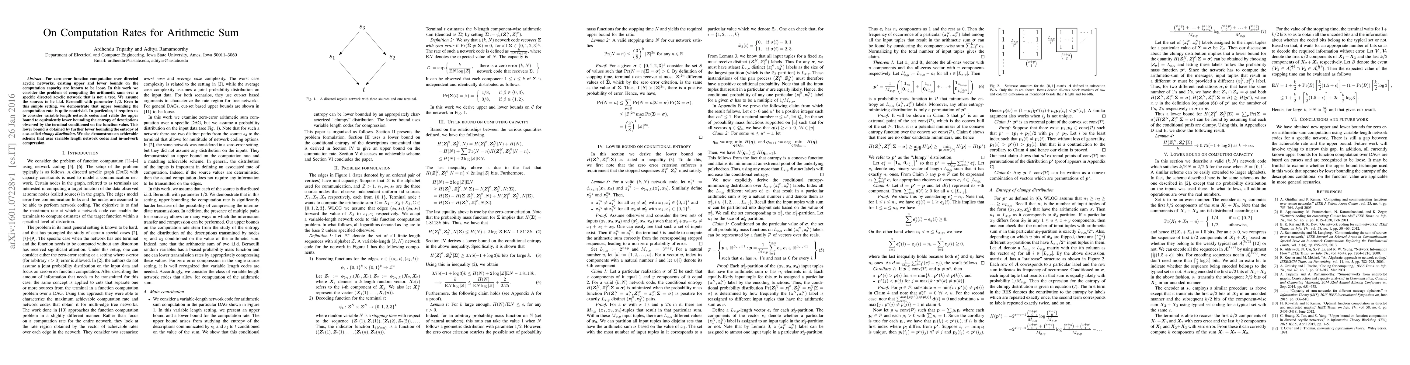 This paper investigates the computation rate for computing arithmetic sums over directed acyclic networks, showing that upper bounds are nontrivial and require variable length network codes. It establishes a lower bound by relating it to the entropy of descriptions conditioned on the function value and demonstrates an achievable scheme using in-network compression.