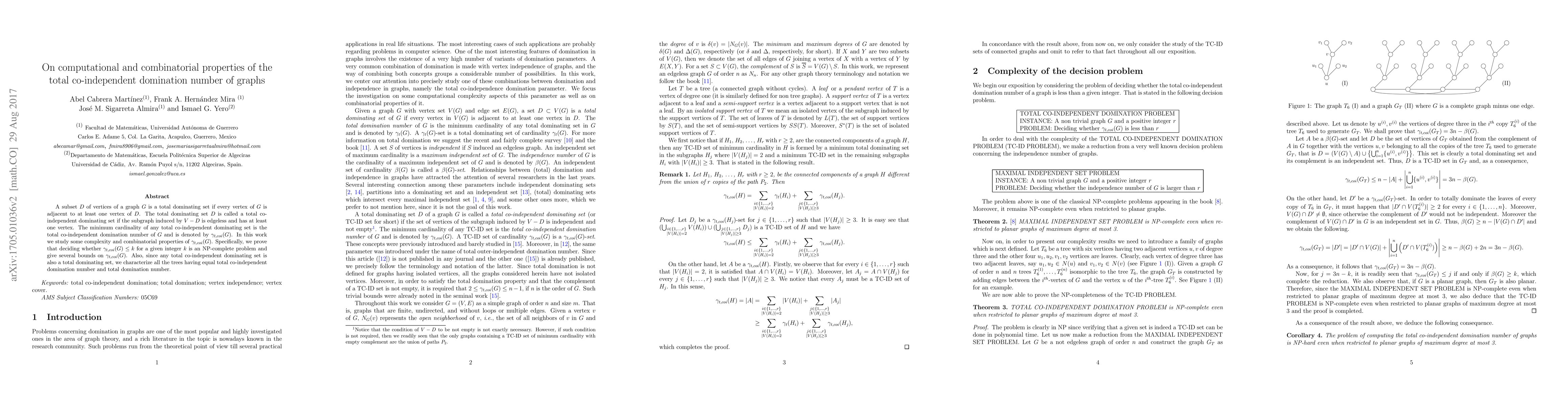 A subset $D$ of vertices of a graph $G$ is a total dominating set if every vertex of $G$ is adjacent to at least one vertex of $D$. The total dominating set $D$ is called a total co-independent dominating set if the subgraph induced by $V-D$ is edgeless and has at least one vertex. The minimum cardinality of any total co-independent dominating set is the total co-independent domination number of $G$ and is denoted by $\gamma_{t,coi}(G)$. In this work we study some complexity and combinatorial properties of $\gamma_{t,coi}(G)$. Specifically, we prove that deciding whether $\gamma_{t,coi}(G)\le k$ for a given integer $k$ is an NP-complete problem and give several bounds on $\gamma_{t,coi}(G)$. Also, since any total co-independent dominating set is also a total dominating set, we characterize all the trees having equal total co-independent domination number and total domination number.