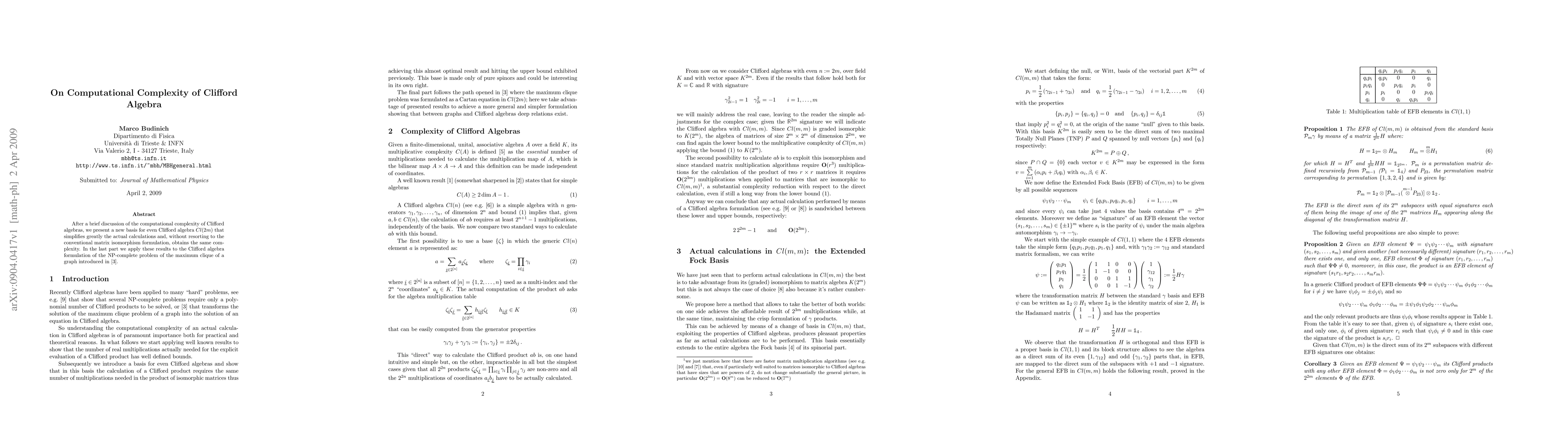After a brief discussion of the computational complexity of Clifford algebras, we present a new basis for even Clifford algebra Cl(2m) that simplifies greatly the actual calculations and, without resorting to the conventional matrix isomorphism formulation, obtains the same complexity. In the last part we apply these results to the Clifford algebra formulation of the NP-complete problem of the maximum clique of a graph introduced in a previous paper.