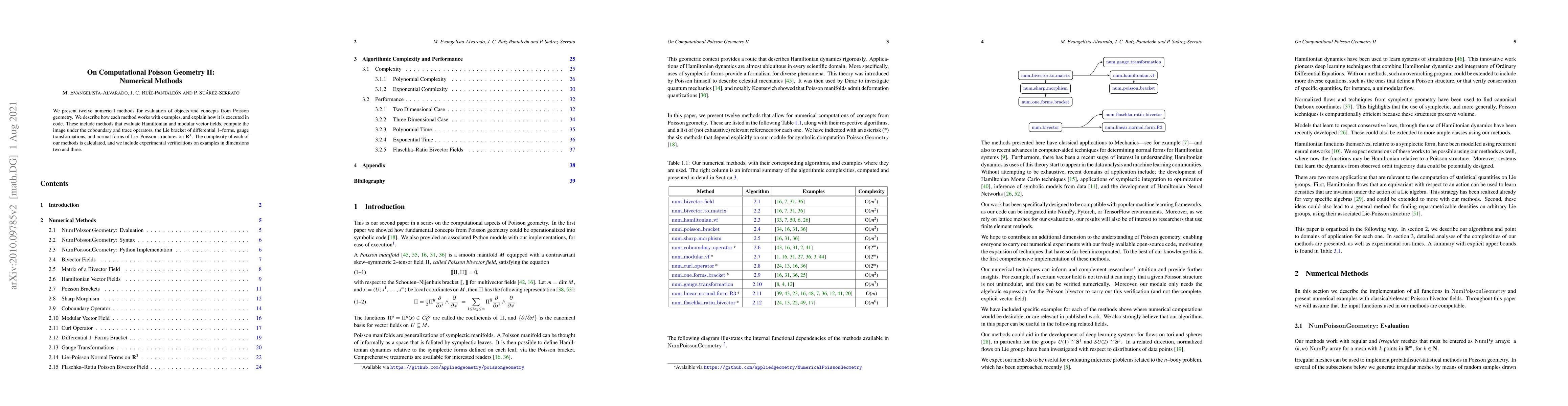 We present twelve numerical methods for evaluation of objects and concepts from Poisson geometry. We describe how each method works with examples, and explain how it is executed in code. These include methods that evaluate Hamiltonian and modular vector fields, compute the image under the coboundary and trace operators, the Lie bracket of differential 1-forms, gauge transformations, and normal forms of Lie-Poisson structures on $\mathbf{R}^{3}$. The complexity of each of our methods is calculated, and we include experimental verifications on examples in dimensions two and three.