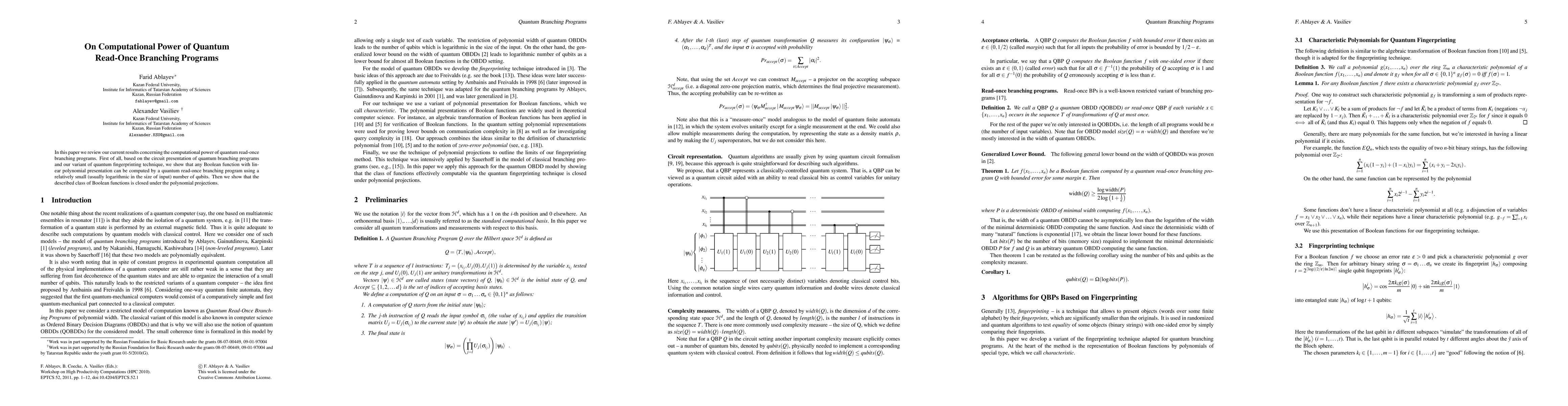 In this paper we review our current results concerning the computational power of quantum read-once branching programs. First of all, based on the circuit presentation of quantum branching programs and our variant of quantum fingerprinting technique, we show that any Boolean function with linear polynomial presentation can be computed by a quantum read-once branching program using a relatively small (usually logarithmic in the size of input) number of qubits. Then we show that the described class of Boolean functions is closed under the polynomial projections.