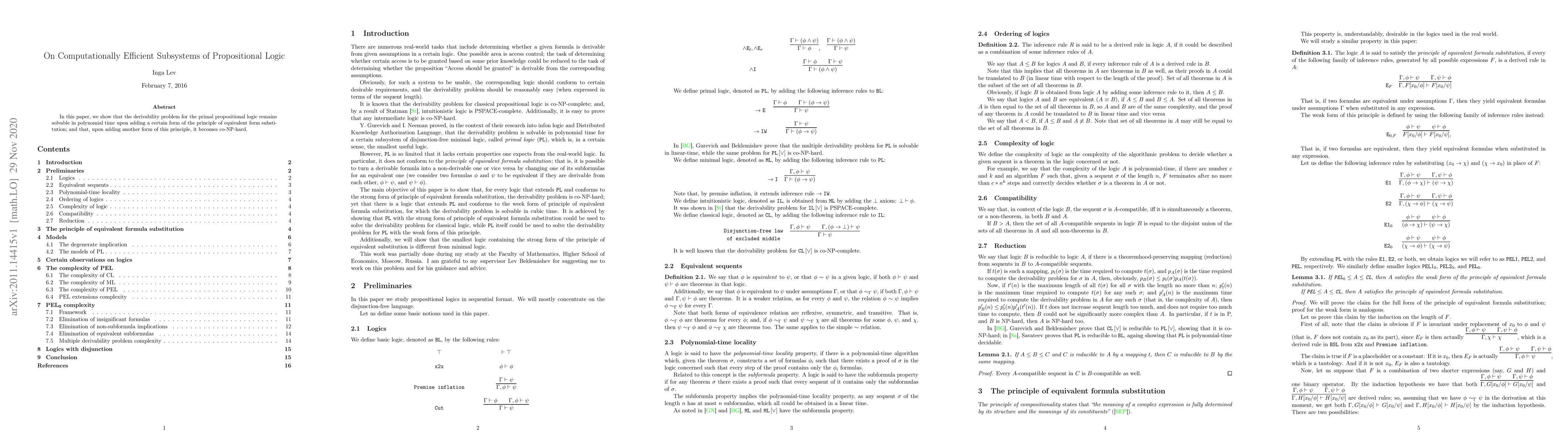 In this paper, we show that the derivability problem for the primal propositional logic remains solvable in polynomial time upon adding a certain form of the principle of equivalent form substitution; and that, upon adding another form of this principle, it becomes co-NP-hard.