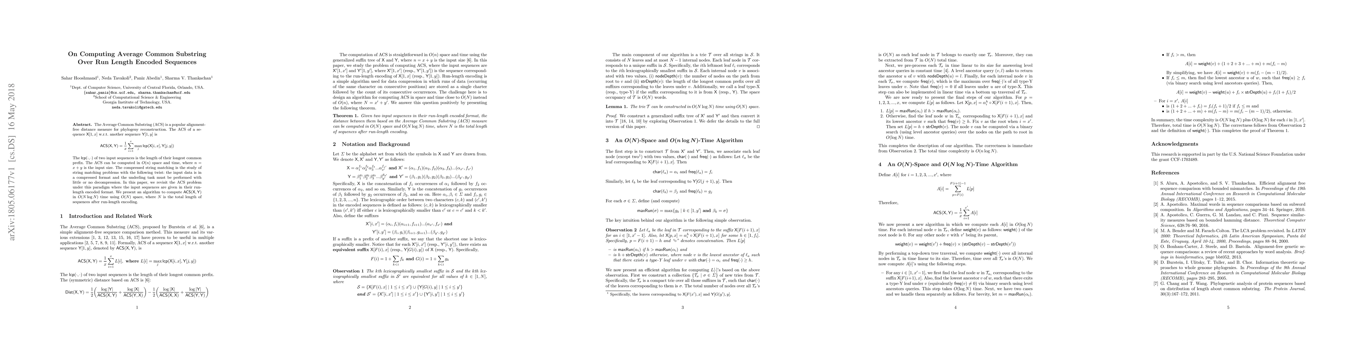 Researchers developed an algorithm to compute Average Common Substring in O(Nlog N) time using O(N) space, improving on the original O(n) time complexity for run-length encoded sequences.