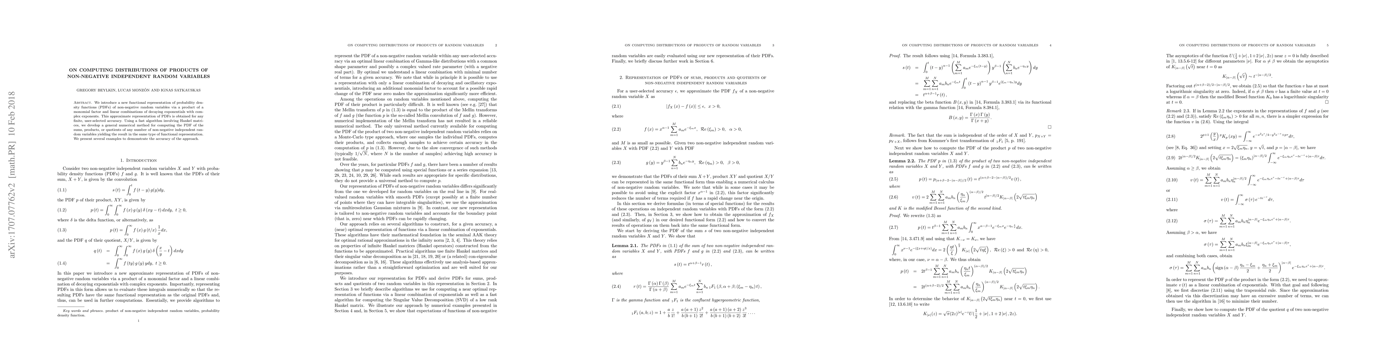 We introduce a new functional representation of probability density functions (PDFs) of non-negative random variables via a product of a monomial factor and linear combinations of decaying exponentials with complex exponents. This approximate representation of PDFs is obtained for any finite, user-selected accuracy. Using a fast algorithm involving Hankel matrices, we develop a general numerical method for computing the PDF of the sums, products, or quotients of any number of non-negative random variables yielding the result in the same type of functional representation. We present several examples to demonstrate the accuracy of the approach.