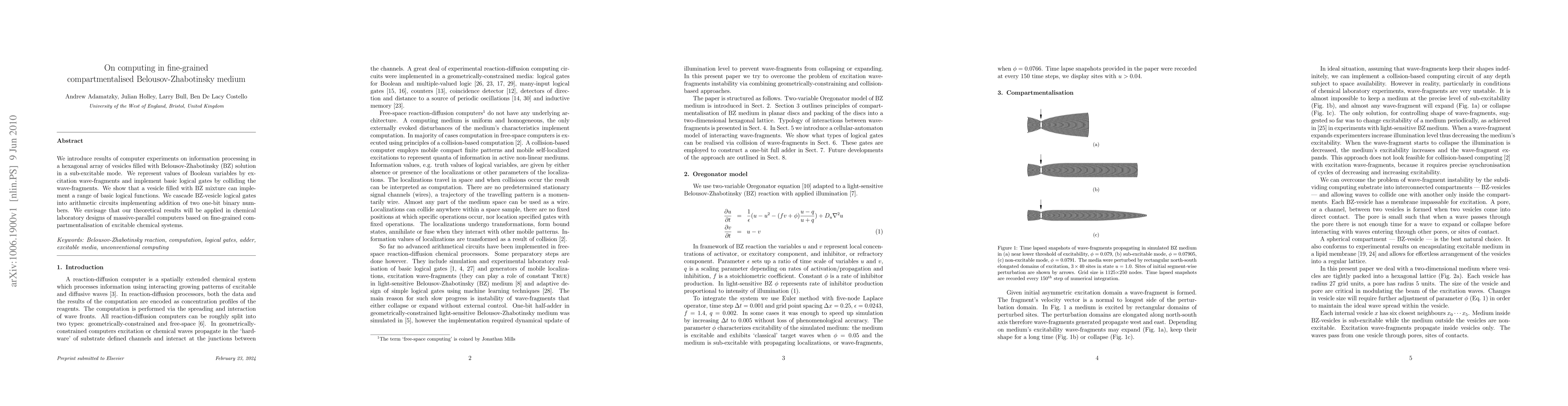 We introduce results of computer experiments on information processing in a hexagonal array of vesicles filled with Belousov-Zhabotinsky (BZ) solution in a sub-excitable mode. We represent values of Boolean variables by excitation wave-fragments and implement basic logical gates by colliding the wave-fragments. We show that a vesicle filled with BZ mixture can implement a range of basic logical functions. We cascade BZ-vesicle logical gates into arithmetic circuits implementing addition of two one-bit binary numbers. We envisage that our theoretical results will be applied in chemical laboratory designs of massive-parallel computers based on fine-grained compartmentalisation of excitable chemical systems.
