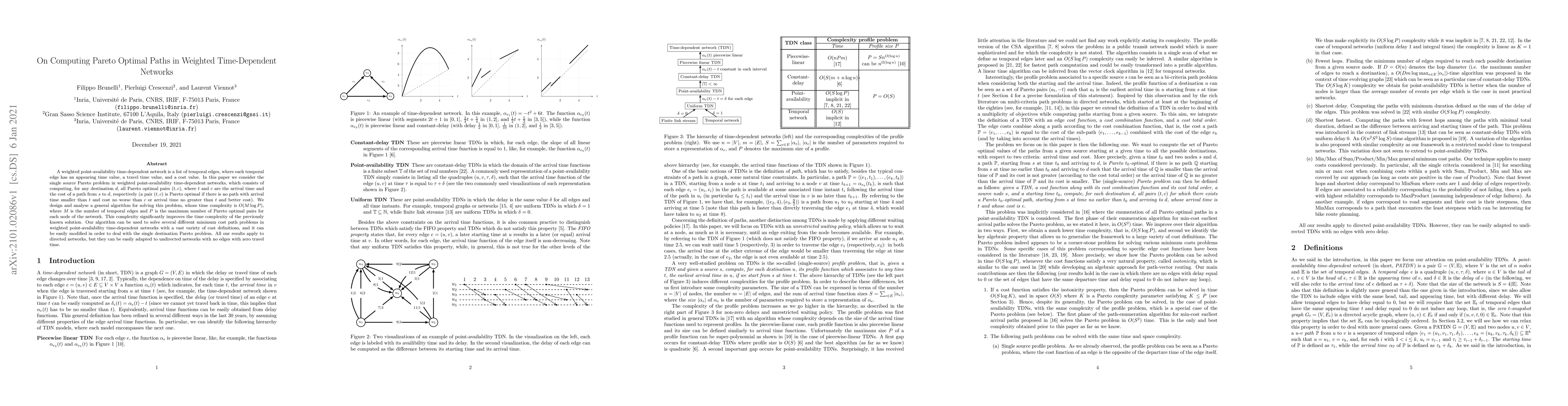 A weighted point-availability time-dependent network is a list of temporal edges, where each temporal edge has an appearing time value, a travel time value, and a cost value. In this paper we consider the single source Pareto problem in weighted point-availability time-dependent networks, which consists of computing, for any destination d, all Pareto optimal pairs (t, c), where t and c are the arrival time and the cost of a path from s to d, respectively (a pair (t, c) is Pareto optimal if there is no path with arrival time smaller than t and cost no worse than c or arrival time no greater than t and better cost). We design and analyse a general algorithm for solving this problem, whose time complexity is O(M log P), where M is the number of temporal edges and P is the maximum number of Pareto optimal pairs for each node of the network. This complexity significantly improves the time complexity of the previously known solution. Our algorithm can be used to solve several different minimum cost path problems in weighted point-availability time-dependent networks with a vast variety of cost definitions, and it can be easily modified in order to deal with the single destination Pareto problem. All our results apply to directed networks, but they can be easily adapted to undirected networks with no edges with zero travel time.