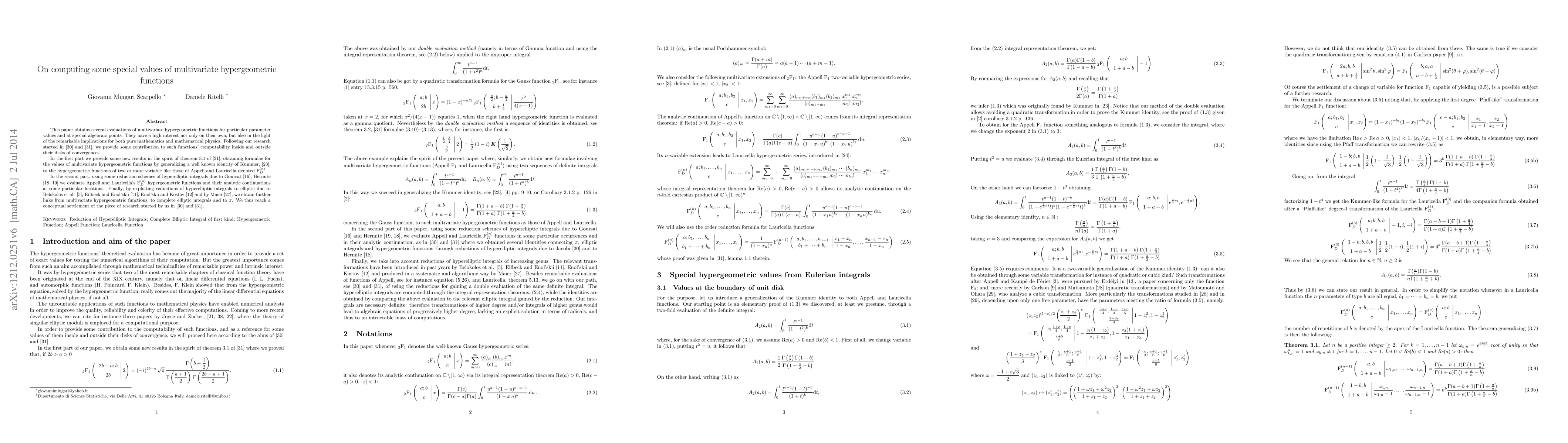 The theoretical computing of special values assumed by the hypergeometric functions has a high interest not only on its own, but also in sight of the remarkable implications to both pure Mathematics and Mathematical Physics. Accordingly, in this paper we continue the path of research started in two our previous papers appeared on [30] and [31] providing some contribution to such functions computability inside and outside their disk of convergence. This is accomplished through two different approaches. The first is to provide some new results in the spirit of theorem 3.1 of 31] obtaining formulae for multivariable hypergeometric functions by generalizing a well known Kummer's identity to the hypergeometric functions of two or more variable like those of Appell and Lauricella.