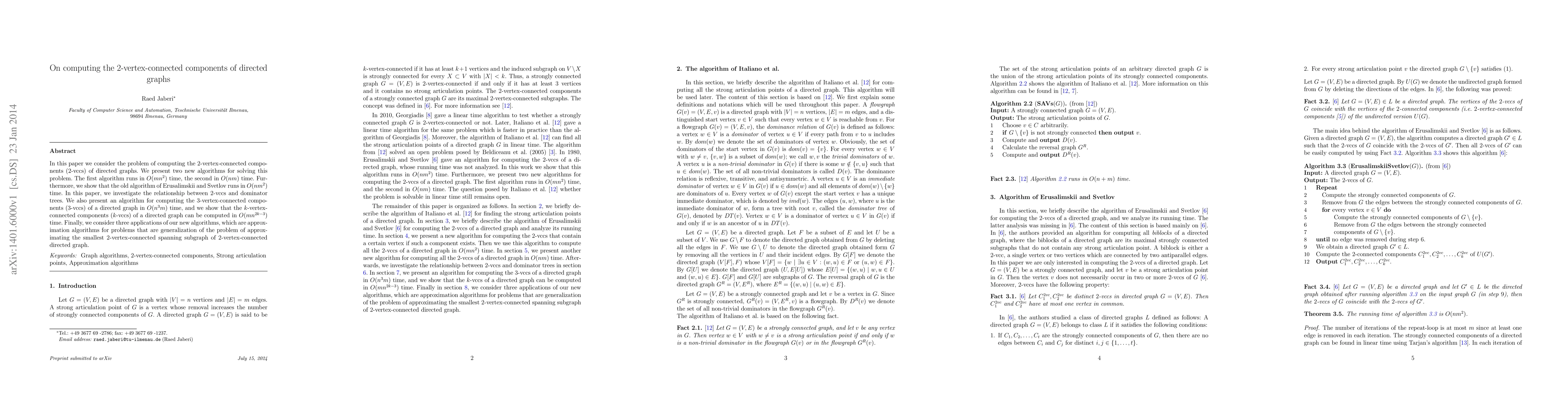 In this paper we consider the problem of computing the $2$-vertex-connected components ($2$-vccs) of directed graphs. We present two new algorithms for solving this problem. The first algorithm runs in $O(mn^{2})$ time, the second in $O(nm)$ time. Furthermore, we show that the old algorithm of Erusalimskii and Svetlov runs in $O(nm^{2})$ time. In this paper, we investigate the relationship between $2$-vccs and dominator trees. We also present an algorithm for computing the $3$-vertex-connected components ($3$-vccs) of a directed graph in $O(n^{3}m)$ time, and we show that the $k$-vertex-connected components ($k$-vccs) of a directed graph can be computed in $O(mn^{2k-3})$ time. Finally, we consider three applications of our new algorithms, which are approximation algorithms for problems that are generalization of the problem of approximating the smallest $2$-vertex-connected spanning subgraph of $2$-vertex-connected directed graph.
