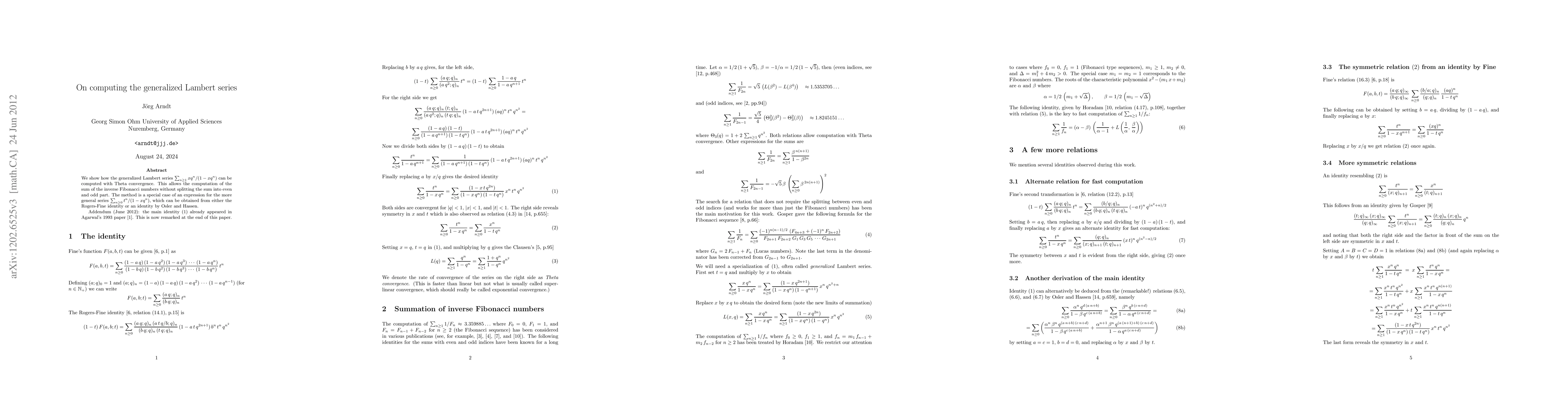 We show how the generalized Lambert series sum(n>=1, x*q^n/(1-x*q^n)) can be computed with Theta convergence. This allows the computation of the sum of the inverse Fibonacci numbers without splitting the sum into even and odd part. The method is a special case of an expression for the more general series sum(n>=0, t^n/(1-x*q^n)), which can be obtained from either the Rogers-Fine identity or an identity by Osler and Hassen.