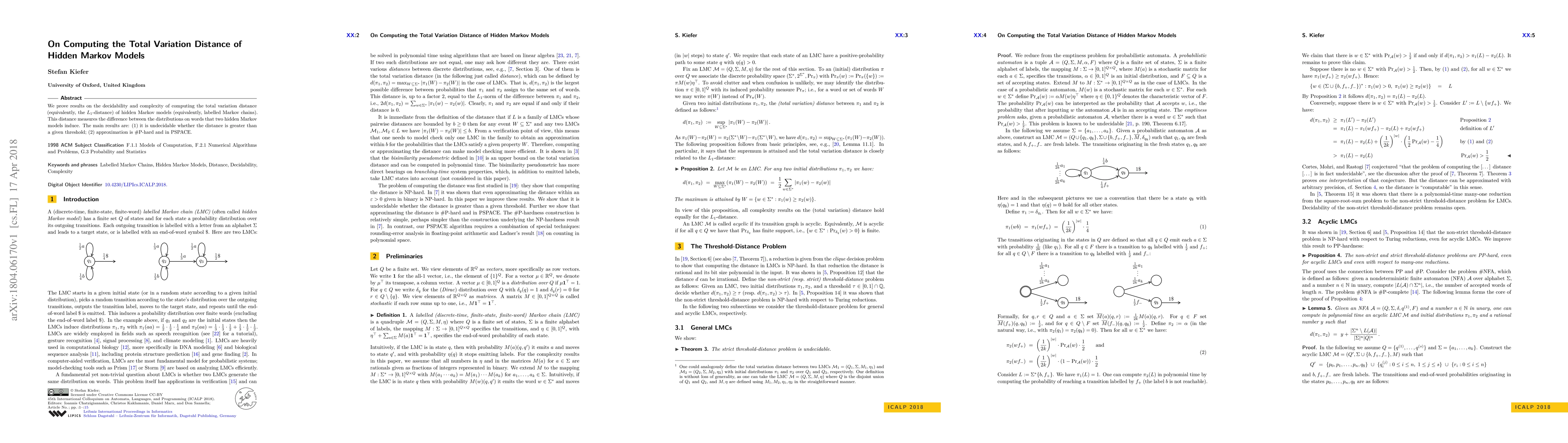 This paper investigates the decidability and complexity of computing the total variation distance between hidden Markov models, showing that determining if the distance exceeds a threshold is undecidable, while approximation is #P-hard and can be solved in PSPACE.