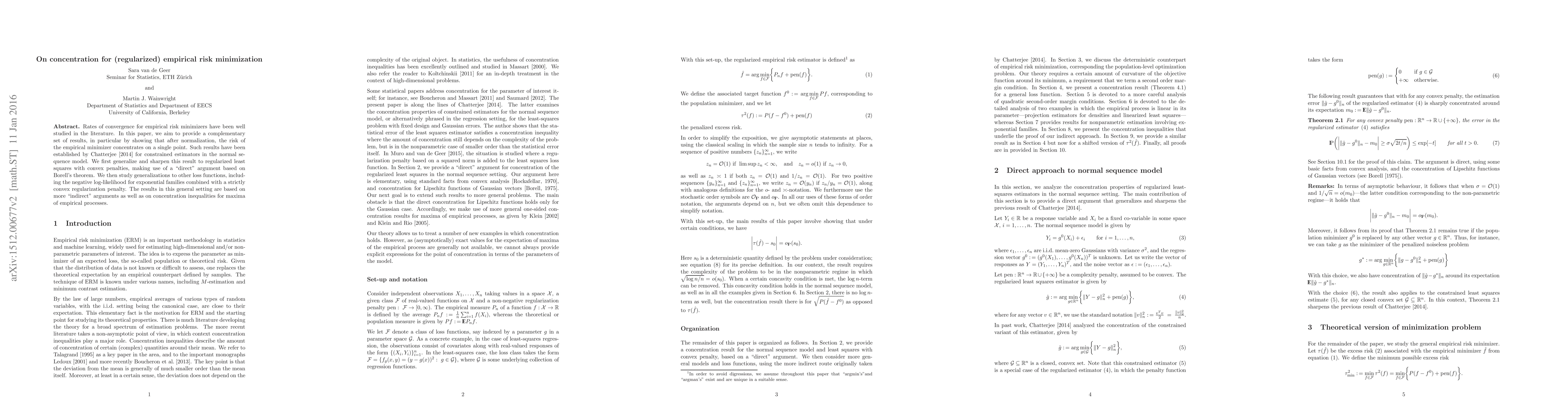 This paper investigates concentration properties of regularized empirical risk minimization, showing that normalized risk of the empirical minimizer converges to a single point. It generalizes and sharpens previous results for constrained estimators, applying "direct" arguments based on Borell's theorem to regularized least squares and "indirect" methods for other loss functions like negative log-likelihood with exponential families.