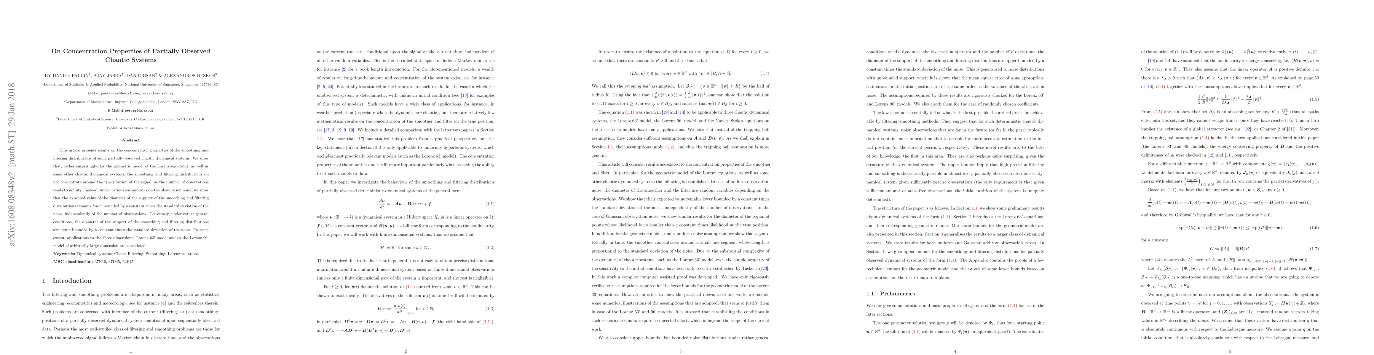This article presents results on the concentration properties of the smoothing and filtering distributions of some partially observed chaotic dynamical systems. We show that, rather surprisingly, for the geometric model of the Lorenz equations, as well as some other chaotic dynamical systems, the smoothing and filtering distributions do not concentrate around the true position of the signal, as the number of observations tends to infinity. Instead, under various assumptions on the observation noise, we show that the expected value of the diameter of the support of the smoothing and filtering distributions remains lower bounded by a constant times the standard deviation of the noise, independently of the number of observations. Conversely, under rather general conditions, the diameter of the support of the smoothing and filtering distributions are upper bounded by a constant times the standard deviation of the noise. To some extent, applications to the three dimensional Lorenz 63' model and to the Lorenz 96' model of arbitrarily large dimension are considered.