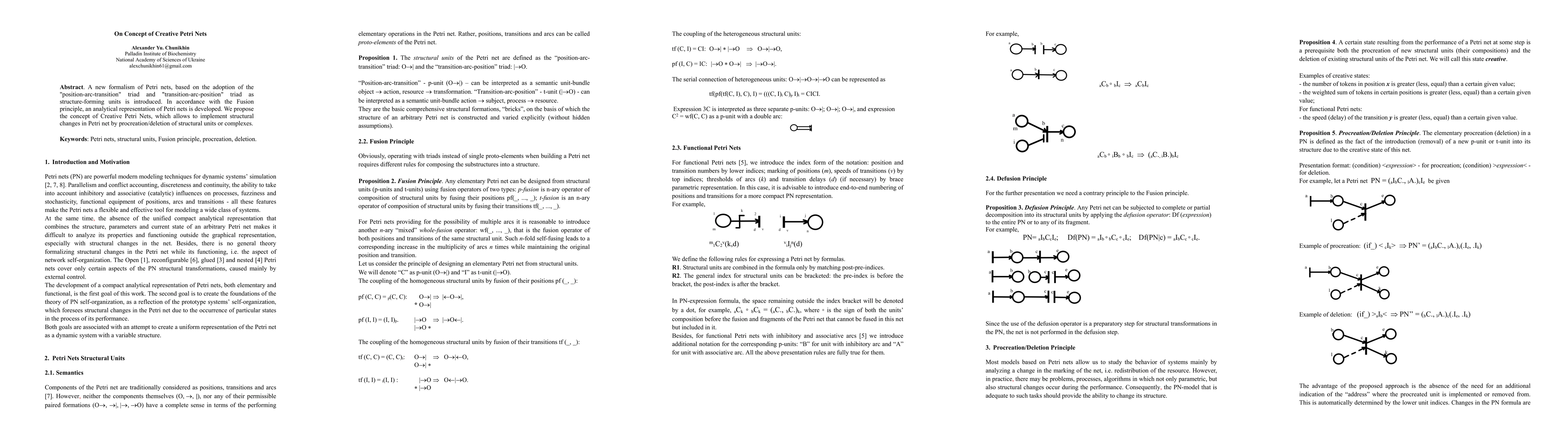 A new formalism of Petri nets, based on the adoption of the "position-arc-transition" triad and "transition-arc-position" triad as structure-forming units is introduced. In accordance with the Fusion principle, an analytical representation of Petri nets is developed. We propose the concept of Creative Petri Nets, which allows to implement structural changes in Petri net by procreation/deletion of structural units or complexes.