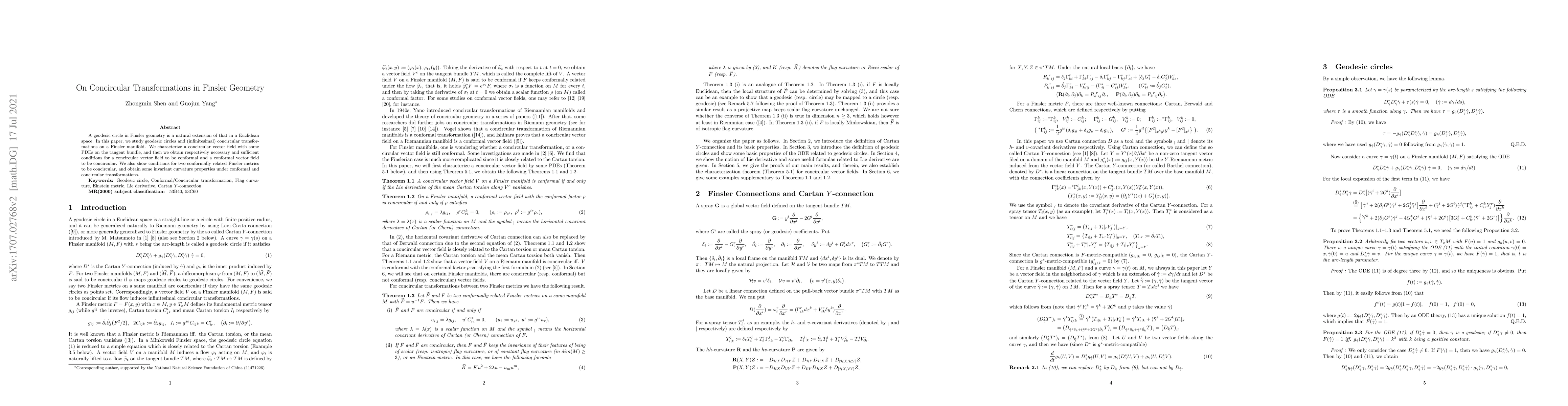 A geodesic circle in Finsler geometry is a natural extension of that in a Euclidean space. In this paper, we apply Lie derivatives and the Cartan $Y$-connection to study geodesic circles and (infinitesimal) concircular transformations on a Finsler manifold. We characterize a concircular vector field with some PDEs on the tangent bundle, and then we obtain respective necessary and sufficient conditions for a concircular vector field to be conformal and a conformal vector field to be concircular. We also show conditions for two conformally related Finsler metrics to be concircular, and obtain some invariant curvature properties under conformal and concircular transformations.