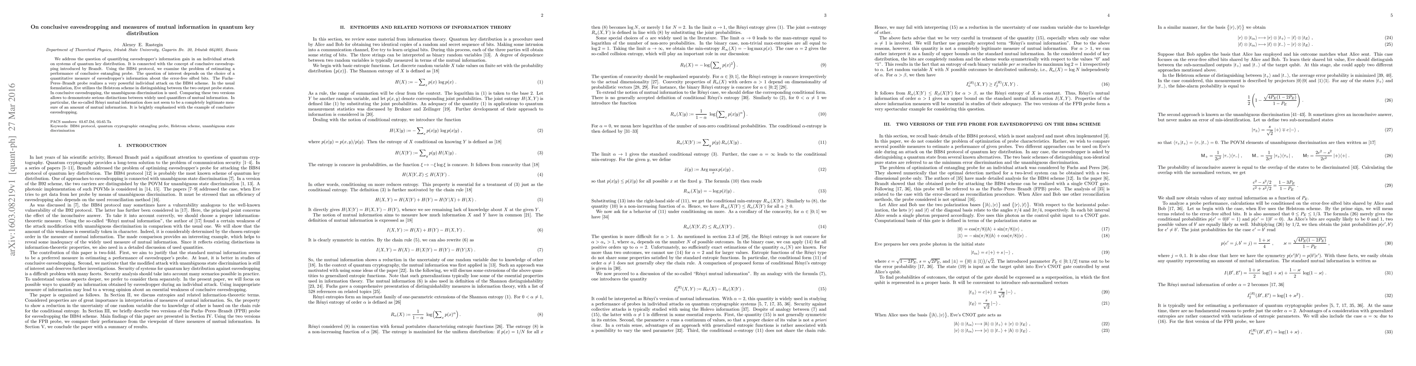 The paper presents a detailed comparison of Helstrom and unambiguous discrimination schemes, highlighting the limitations of Rényi mutual information as a measure of eavesdropper's information gain in quantum key distribution.