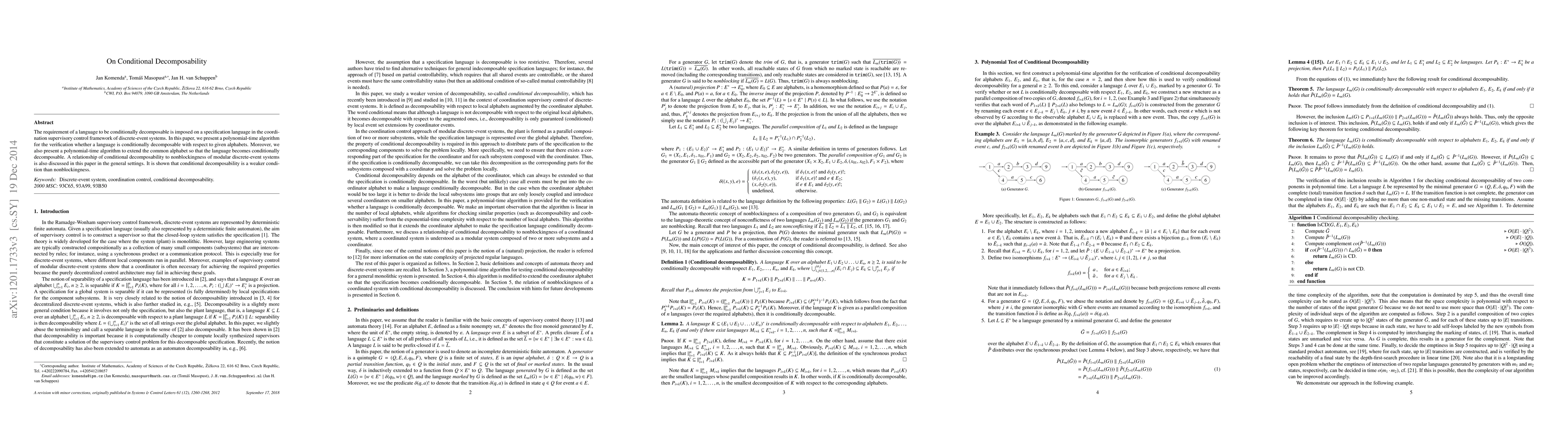 The requirement of a language to be conditionally decomposable is imposed on a specification language in the coordination supervisory control framework of discrete-event systems. In this paper, we present a polynomial-time algorithm for the verification whether a language is conditionally decomposable with respect to given alphabets. Moreover, we also present a polynomial-time algorithm to extend the common alphabet so that the language becomes conditionally decomposable. A relationship of conditional decomposability to nonblockingness of modular discrete-event systems is also discussed in this paper in the general settings. It is shown that conditional decomposability is a weaker condition than nonblockingness.
