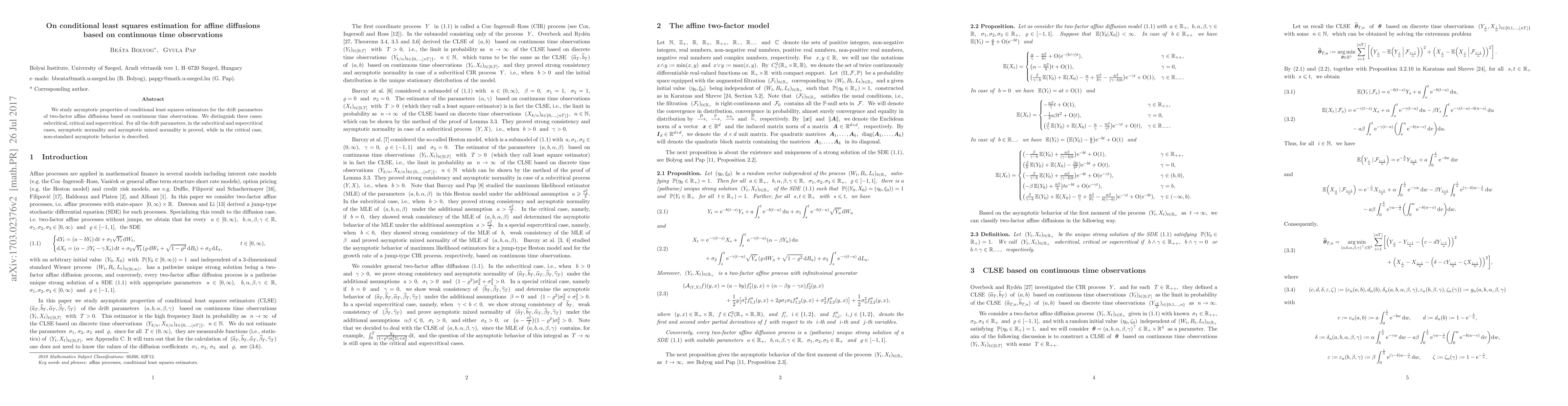 This paper investigates the asymptotic properties of conditional least squares estimators for drift parameters in two-factor affine diffusions observed continuously. It proves asymptotic normality and mixed normality for subcritical and supercritical cases, while detailing non-standard asymptotic behavior for the critical case.