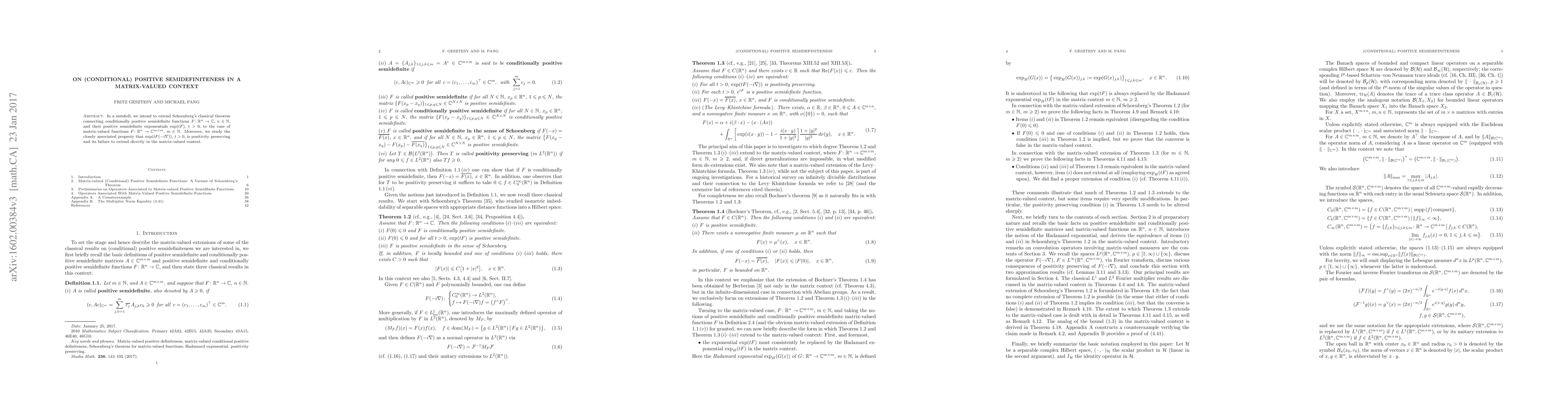 In a nutshell, we intend to extend Schoenberg's classical theorem connecting conditionally positive semidefinite functions $F\colon \mathbb{R}^n \to \mathbb{C}$, $n \in \mathbb{N}$, and their positive semidefinite exponentials $\exp(tF)$, $t > 0$, to the case of matrix-valued functions $F \colon \mathbb{R}^n \to \mathbb{C}^{m \times m}$, $m \in \mathbb{N}$. Moreover, we study the closely associated property that $\exp(t F(- i \nabla))$, $t>0$, is positivity preserving and its failure to extend directly in the matrix-valued context.