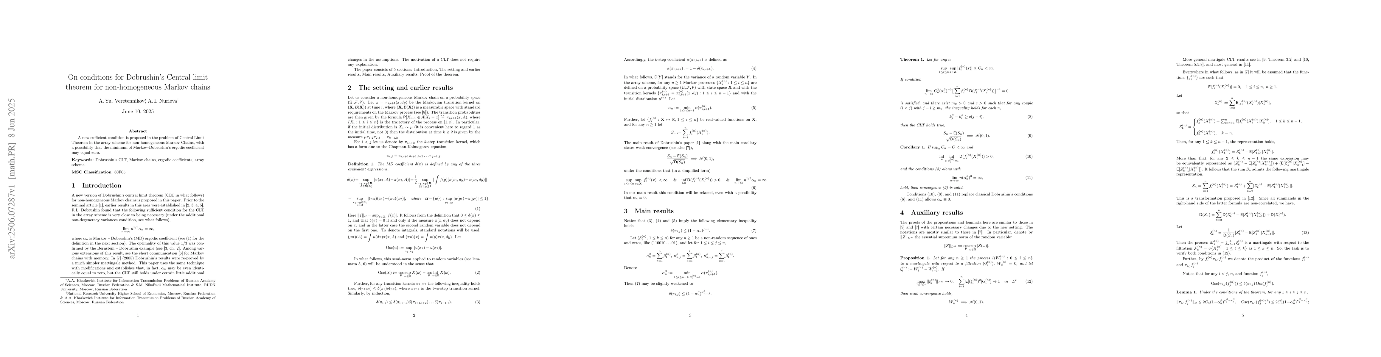 This research introduces a novel sufficient condition for Dobrushin's Central Limit Theorem in non-homogeneous Markov Chains, potentially allowing the Markov-Dobrushin ergodic coefficient to be zero.
