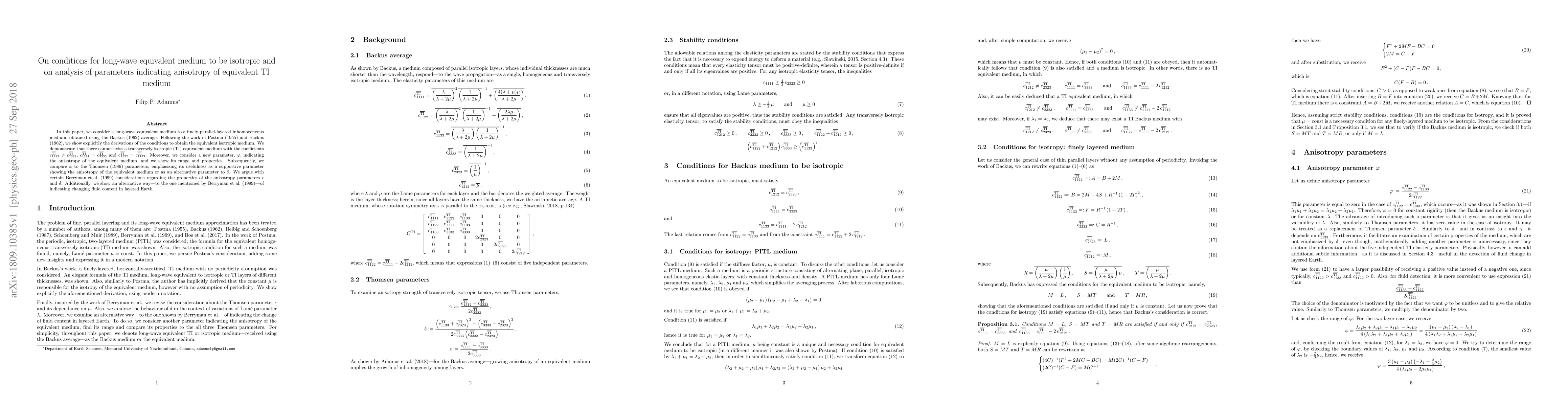 In this paper, we consider a long-wave equivalent medium to a finely parallel-layered inhomogeneous medium, obtained using the Backus average. Following the work of Postma and Backus, we show explicitly the derivations of the conditions to obtain the equivalent isotropic medium. We demonstrate that there cannot exist a transversely isotropic (TI) equivalent medium with the coefficients $c^{\overline{\rm TI}}_{1212} \neq c^{\overline{\rm TI}}_{2323}$, $c^{\overline{\rm TI}}_{1111} = c^{\overline{\rm TI}}_{3333}$ and $c^{\overline{\rm TI}}_{1122} = c^{\overline{\rm TI}}_{1133}$. Moreover, we consider a new parameter, $\varphi$, indicating the anisotropy of the equivalent medium, and we show its range and properties. Subsequently, we compare $\varphi$ to the Thomsen parameters, emphasizing its usefulness as a supportive parameter showing the anisotropy of the equivalent medium or as an alternative parameter to $\delta$. We argue with certain Berryman et al. considerations regarding the properties of the anisotropy parameters $\epsilon$ and $\delta$. Additionally, we show an alternative way---to the one mentioned by Berryman et al.---of indicating changing fluid content in layered Earth.