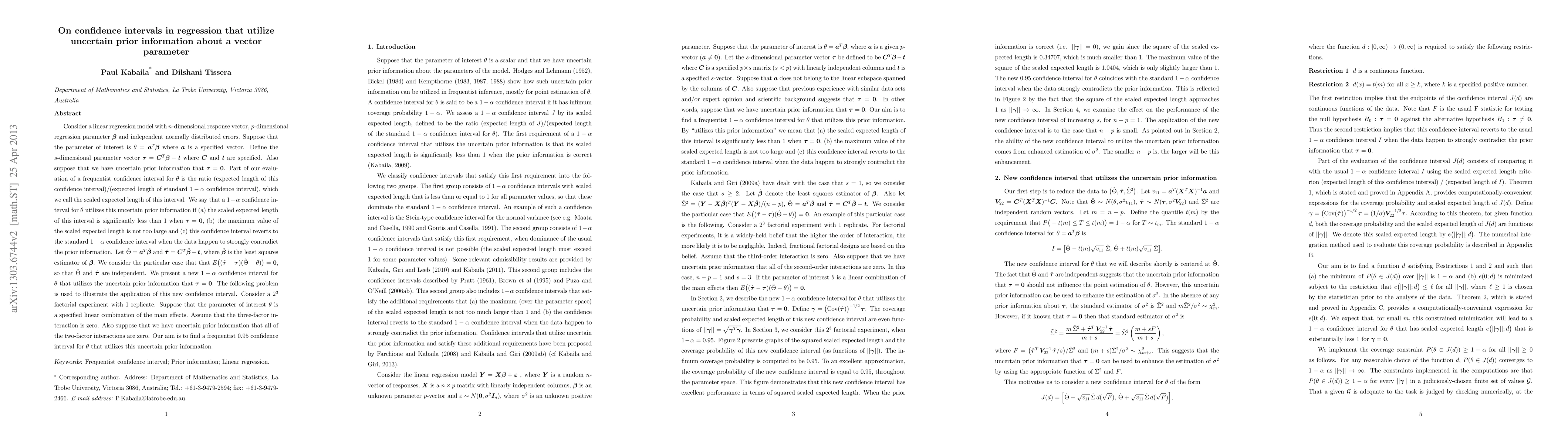 Consider a linear regression model with n-dimensional response vector, p-dimensional regression parameter beta and independent normally distributed errors. Suppose that the parameter of interest is theta = a^T beta where a is a specified vector. Define the s-dimensional parameter vector tau=C^T beta-t where C and t are specified. Also suppose that we have uncertain prior information that tau=0. Part of our evaluation of a frequentist confidence interval for theta is the ratio (expected length of this confidence interval)/(expected length of standard 1-alpha confidence interval), the scaled expected length of this interval. We say that a 1-alpha confidence interval for theta utilizes this uncertain prior information if (a) the scaled expected length of this interval is significantly less than 1 when tau=0, (b) the maximum value of the scaled expected length is not too large and (c) this confidence interval reverts to the standard 1-alpha confidence interval when the data happen to strongly contradict the prior information. Let hat{Theta}=a^T hat{beta} and hat{tau}=C^T hat{beta}-t, where hat{beta} is the least squares estimator of beta. We consider the particular case that that E((hat{tau}-tau)(hat{Theta}-theta))=0, so that hat{Theta} and hat{tau} are independent. We present a new 1-alpha confidence interval for theta that utilizes the uncertain prior informationthat tau=0. The following problem is used to illustrate the application of this new confidence interval. Consider a 2^3 factorial experiment with 1 replicate. Suppose that the parameter of interest theta is a specified linear combination of the main effects. Assume that the three-factorinteraction is zero. Also suppose that we have uncertain prior information that all of the two-factor interactions are zero. Our aim is to find a frequentist 0.95 confidence interval for theta that utilizes this uncertain prior information.