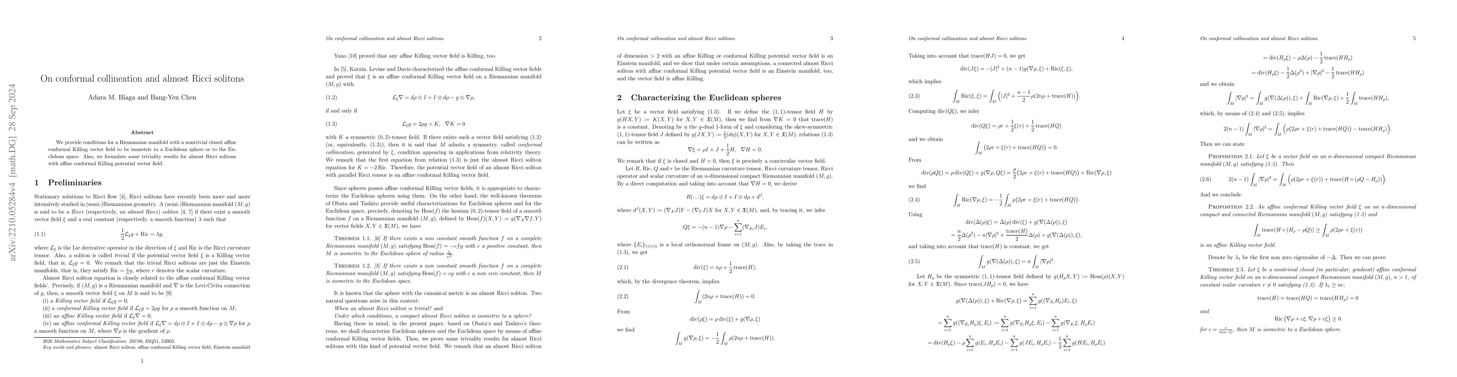 We provide conditions for a Riemannian manifold with a nontrivial closed affine conformal Killing vector field to be isometric to a Euclidean sphere or to the Euclidean space. Also, we formulate some triviality results for almost Ricci solitons with affine conformal Killing potential vector field.