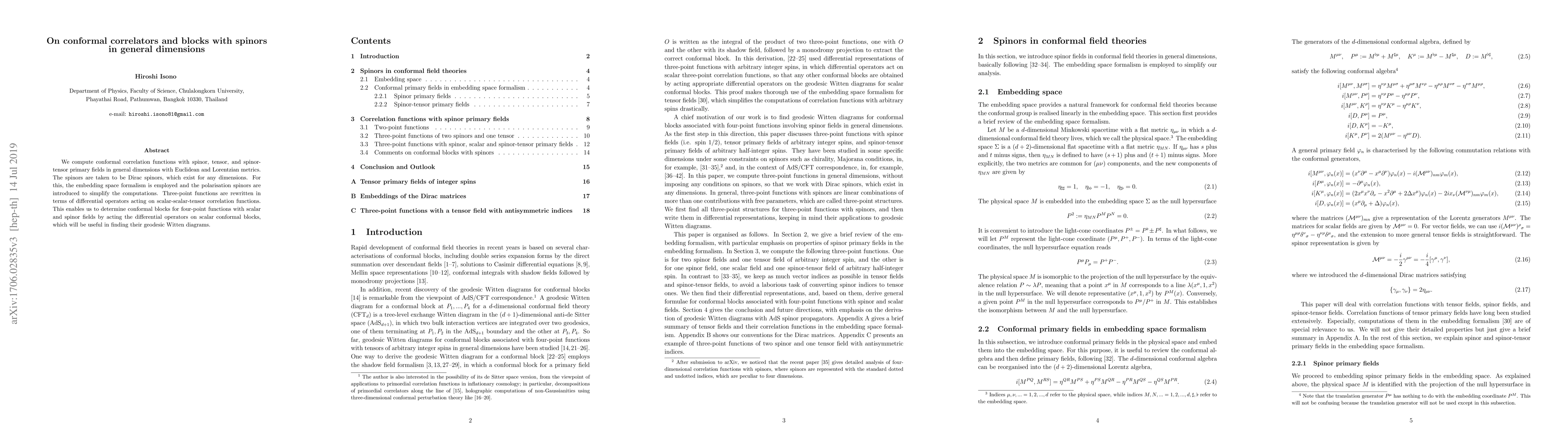 This paper computes conformal correlation functions in general dimensions using the embedding space formalism and polarisation spinors, determining conformal blocks for four-point functions with scalar and spinor fields through differential operators acting on scalar-scalar-tensor correlation functions. The results are useful for finding geodesic Witten diagrams.