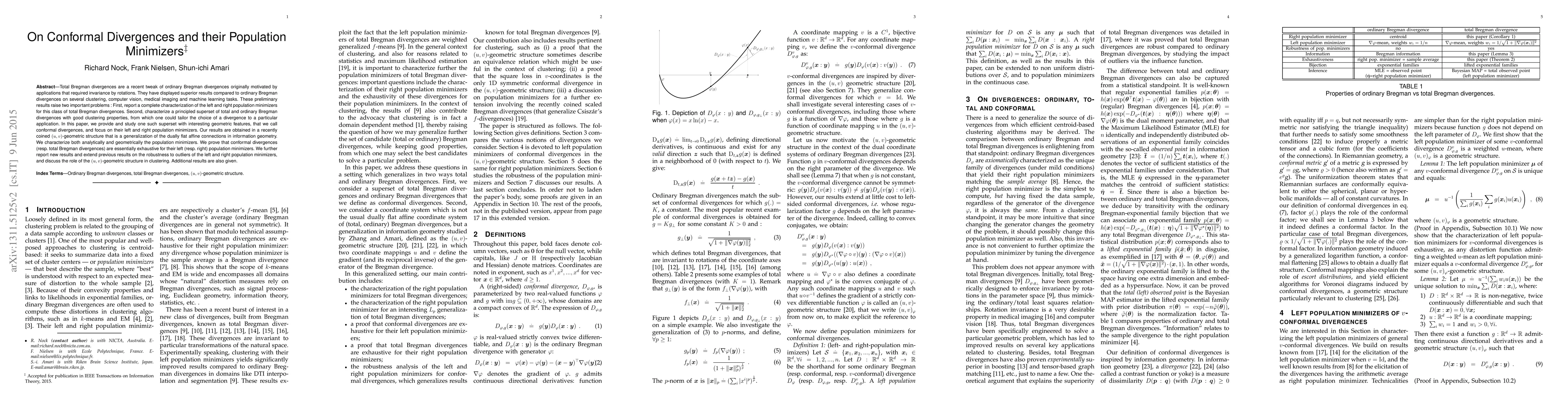 Total Bregman divergences are a recent tweak of ordinary Bregman divergences originally motivated by applications that required invariance by rotations. They have displayed superior results compared to ordinary Bregman divergences on several clustering, computer vision, medical imaging and machine learning tasks. These preliminary results raise two important problems : First, report a complete characterization of the left and right population minimizers for this class of total Bregman divergences. Second, characterize a principled superset of total and ordinary Bregman divergences with good clustering properties, from which one could tailor the choice of a divergence to a particular application. In this paper, we provide and study one such superset with interesting geometric features, that we call conformal divergences, and focus on their left and right population minimizers. Our results are obtained in a recently coined $(u, v)$-geometric structure that is a generalization of the dually flat affine connections in information geometry. We characterize both analytically and geometrically the population minimizers. We prove that conformal divergences (resp. total Bregman divergences) are essentially exhaustive for their left (resp. right) population minimizers. We further report new results and extend previous results on the robustness to outliers of the left and right population minimizers, and discuss the role of the $(u, v)$-geometric structure in clustering. Additional results are also given.