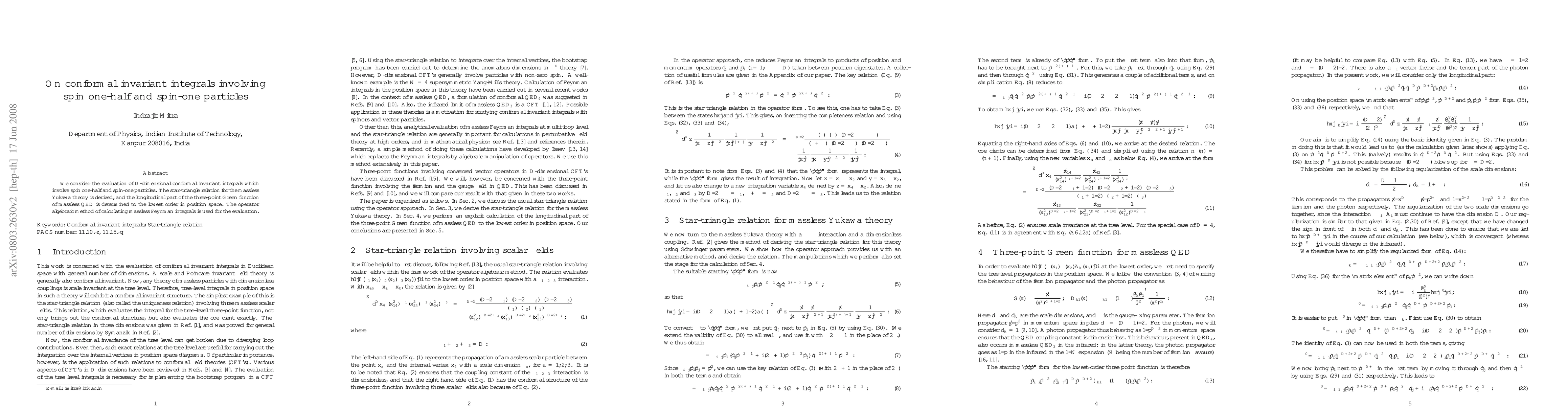 This paper evaluates D-dimensional conformal invariant integrals involving spin one-half and spin-one particles, deriving the star-triangle relation for massless Yukawa theory and determining the longitudinal part of the three-point Green function in QED to the lowest order using the operator algebraic method.