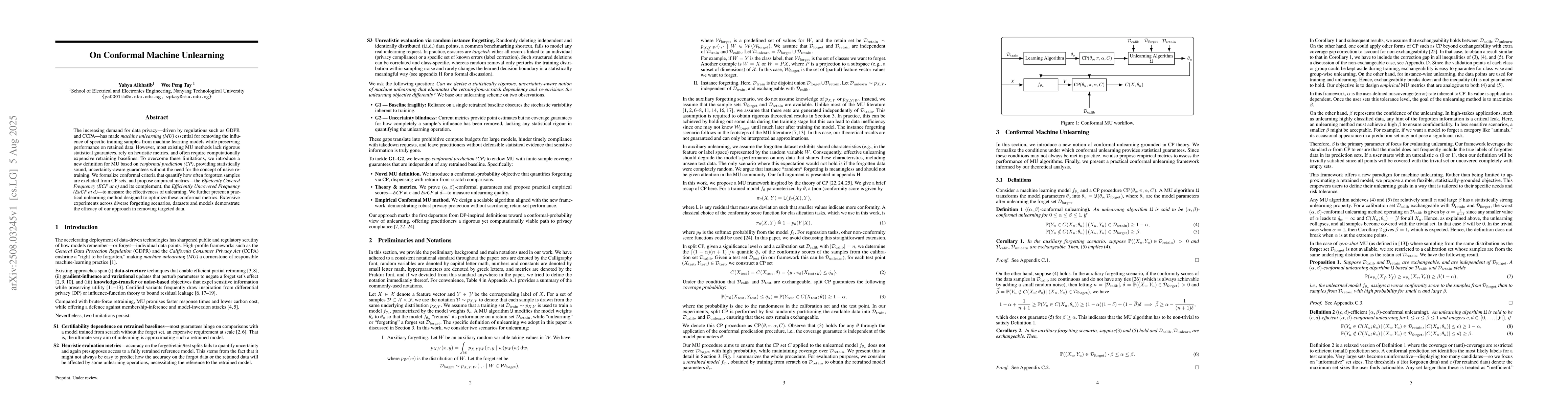 The paper introduces a new definition for Machine Unlearning (MU) based on Conformal Prediction (CP), providing statistically sound, uncertainty-aware guarantees without retraining. It formalizes conformal criteria and proposes empirical metrics (ECF and EuCF) to measure unlearning effectiveness. An unlearning method is presented to optimize these metrics.