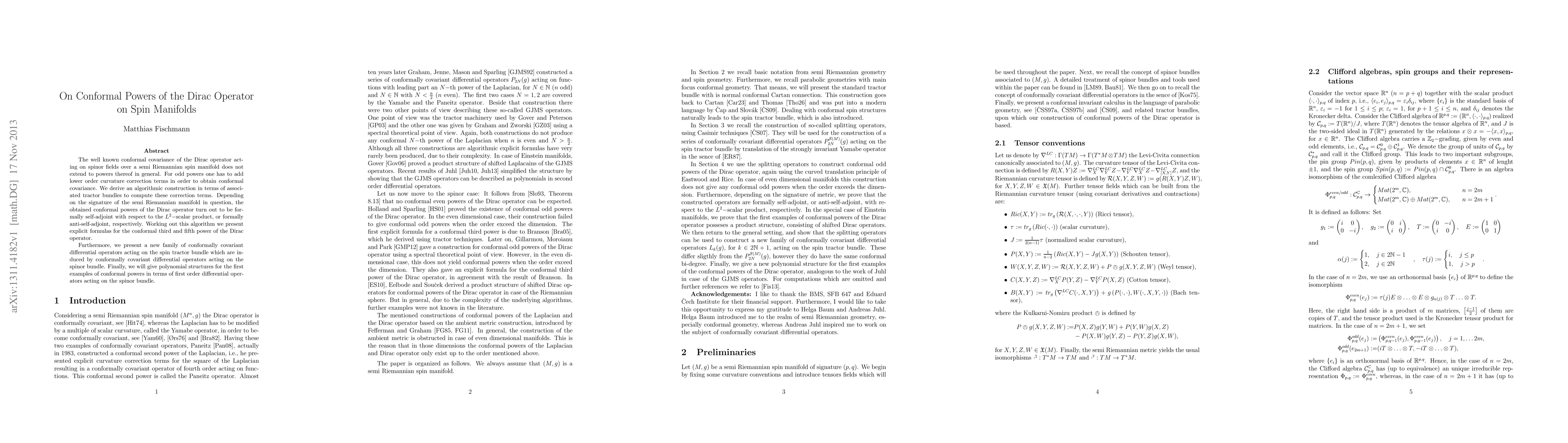 The well known conformal covariance of the Dirac operator acting on spinor fields over a semi Riemannian spin manifold does not extend to powers thereof in general. For odd powers one has to add lower order curvature correction terms in order to obtain conformal covariance. We derive an algorithmic construction in terms of associated tractor bundles to compute these correction terms. Depending on the signature of the semi Riemannian manifold in question, the obtained conformal powers of the Dirac operator turn out to be formally self-adjoint with respect to the $L^2-$scalar product, or formally anti-self-adjoint, respectively. Working out this algorithm we present explicit formulas for the conformal third and fifth power of the Dirac operator. Furthermore, we present a new family of conformally covariant differential operators acting on the spin tractor bundle which are induced by conformally covariant differential operators acting on the spinor bundle. Finally, we will give polynomial structures for the first examples of conformal powers in terms of first order differential operators acting on the spinor bundle.