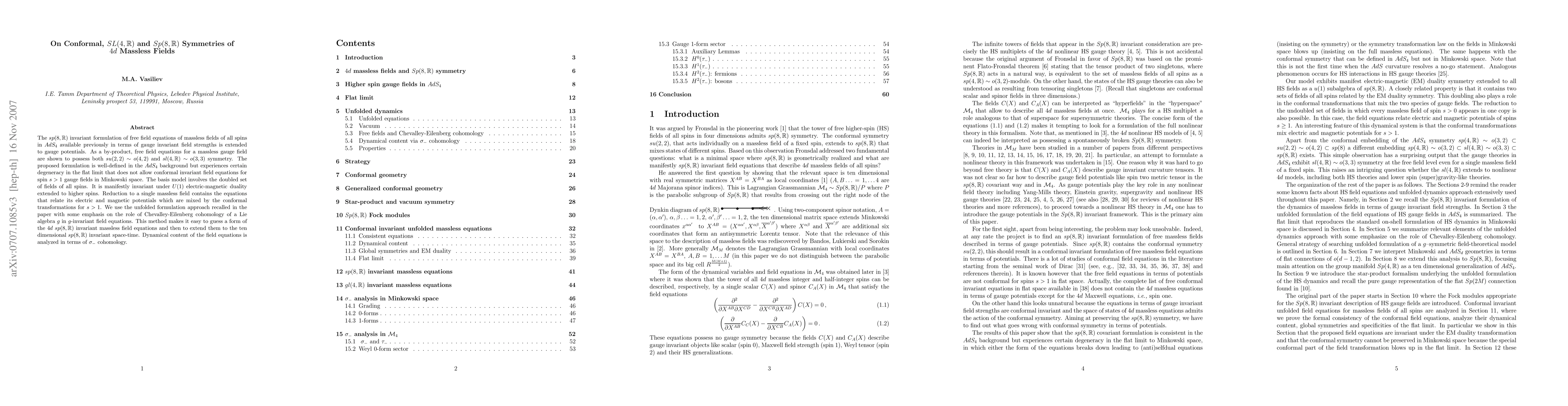 The $sp(8, R)$ invariant formulation of free field equations of massless fields of all spins in $AdS_4$ available previously in terms of gauge invariant field strengths is extended to gauge potentials. As a by-product, free field equations for a massless gauge field are shown to possess both $su(2,2)\sim o(4,2)$ and $sl(4,R)\sim o(3,3)$ symmetry. The proposed formulation is well-defined in the $AdS_4$ background but experiences certain degeneracy in the flat limit that does not allow conformal invariant field equations for spin $s>1$ gauge fields in Minkowski space. The basis model involves the doubled set of fields of all spins. It is manifestly invariant under U(1) electric-magnetic duality extended to higher spins. Reduction to a single massless field contains the equations that relate its electric and magnetic potentials which are mixed by the conformal transformations for s>1. We use the unfolded formulation approach recalled in the paper with some emphasis on the role of Chevalley-Eilenberg cohomology of a Lie algebra $g$ in $g$-invariant field equations. This method makes it easy to guess a form of the 4d $sp(8, R)$ invariant massless field equations and then to extend them to the ten dimensional $sp(8,R)$ invariant space-time. Dynamical content of the field equations is analyzed in terms of $\sigma_-$ cohomology.