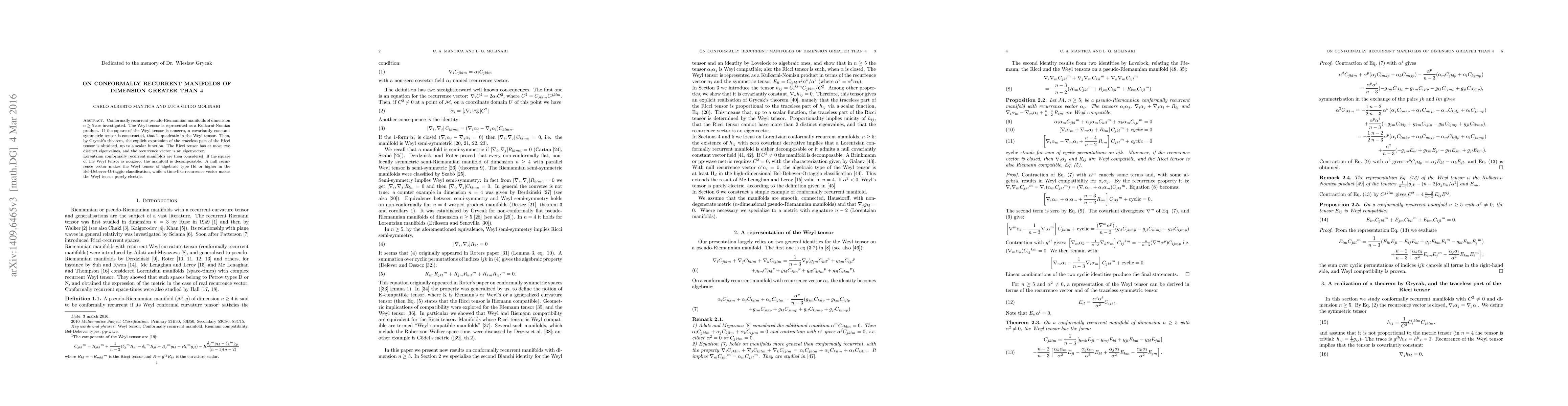 Conformally recurrent pseudo-Riemannian manifolds of dimension n>4 are investigated. The Weyl tensor is represented as a Kulkarni-Nomizu product. If the square of the Weyl tensor is nonzero, a covariantly constant symmetric tensor is constructed, that is quadratic in the Weyl tensor. Then, by Grycak's theorem, the explicit expression of the traceless part of the Ricci tensor is obtained, up to a scalar function. The Ricci tensor has at most two distinct eigenvalues, and the recurrence vector is an eigenvector. Lorentzian conformally recurrent manifolds are then considered. If the square of the Weyl tensor is nonzero, the manifold is decomposable. A null recurrence vector makes the Weyl tensor of algebraic type IId or higher in the Bel - Debever - Ortaggio classification, while a time-like recurrence vector makes the Weyl tensor purely electric.