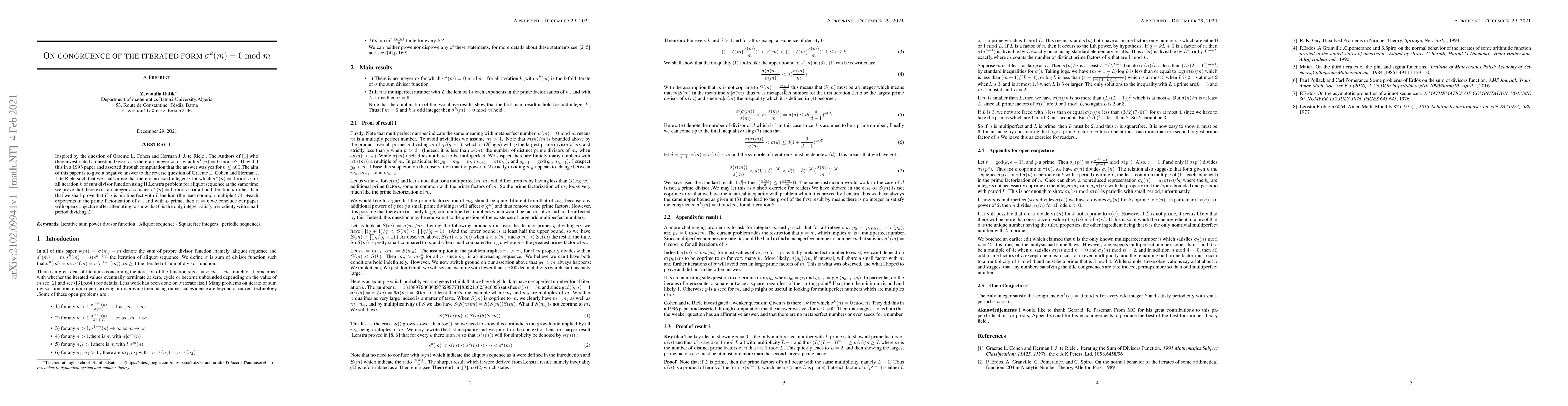 Inspired by the question of Graeme L. Cohen and Herman J. J. te Riele , The Authors of \cite{Graeme L} who they investigated a question Given $n$ is there an integer $k$ for which $\sigma^k(n) = 0 \bmod n$? They did this in a $1995$ paper and asserted through computation that the answer was yes for $n \leq 400$,The aim of this paper is to give a negative answer to the reverse question of Graeme L. Cohen and Herman J. J. te Riele such that we shall prove that there is no fixed integer $n $ for which $\sigma^k(n) = 0 \bmod n$ for all iteration $k$ of sum divisor function using H.Lenstra problem for aliquot sequence at the same time we prove that there exist an integer $n$ satisfies $\sigma^k(n) = 0 \bmod n$ for all odd iteration $k$ rather than that we shall prove that if $n$ is multiperfect with $L$ the lcm (the least common multiple ) of $1$+each exponents in the prime factorization of $n$ , and with $L$ prime, then $n=6$.we conclude our paper with open conjecture after attempting to show that $6$ is the only integer satisfy periodicity with small period dividing $L$