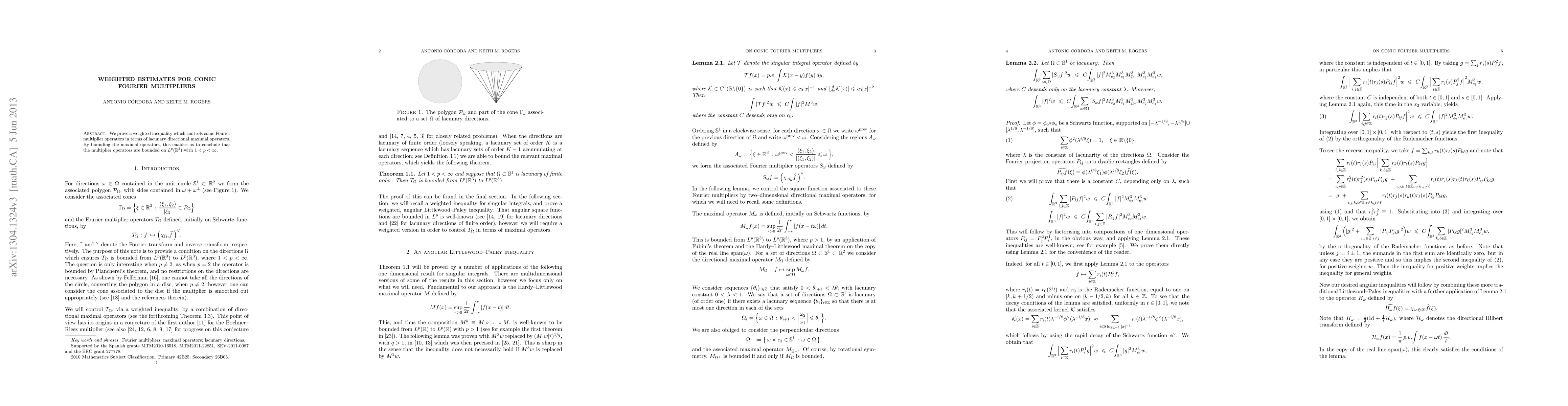 Researchers prove a weighted inequality controlling conic Fourier multiplier operators using lacunary directional maximal operators, enabling bound on $L^p( eal^3)$ with 1<p< ealinfinity.