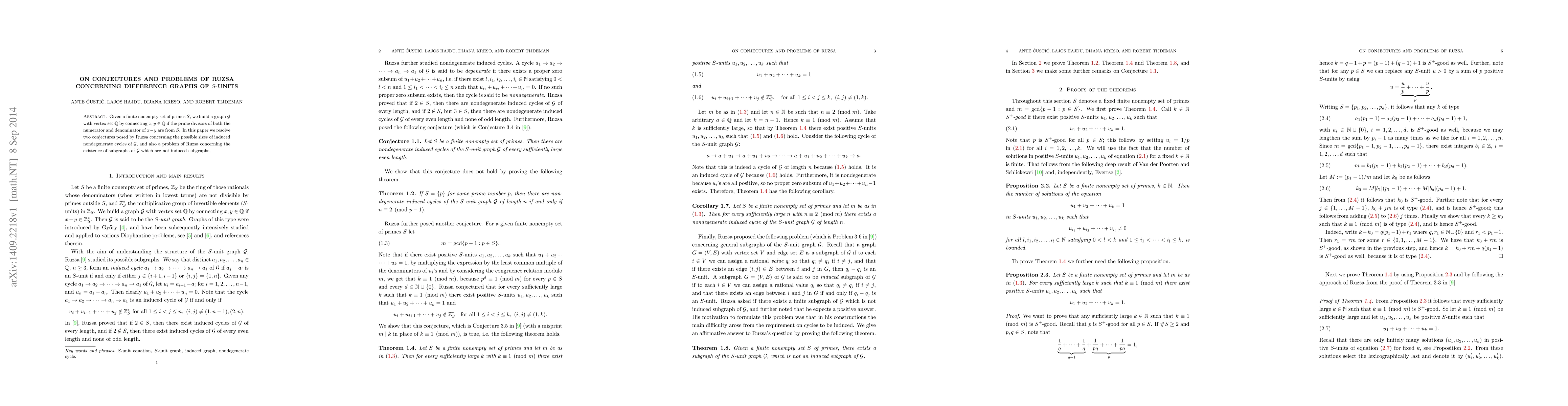 Researchers resolve two conjectures about difference graphs of S-units, showing that induced nondegenerate cycles can exist for certain values of S, while also proving the existence of specific subgraphs.