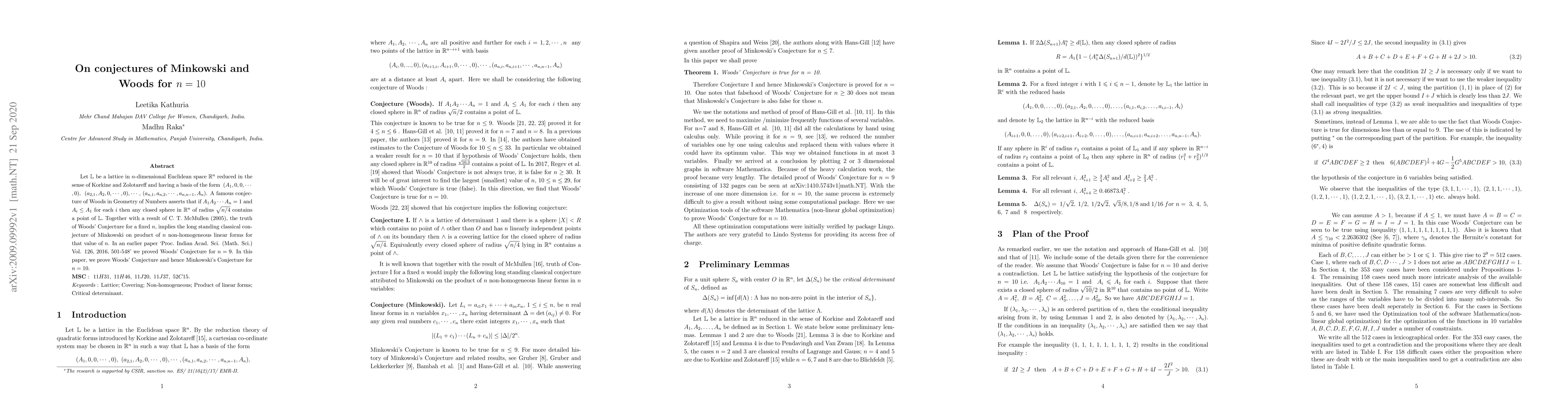 Let $\mathbb{L}$ be a lattice in $n$-dimensional Euclidean space $\mathbb{R}^n$ reduced in the sense of Korkine and Zolotareff and having a basis of the form $~(A_1,0,0,\cdots$ $,0),$ ~$(a_{2,1},A_2,0,\cdots,0),\cdots,$ $(a_{n,1},a_{n,2},\cdots,a_{n,n-1},A_n)$. A famous conjecture of Woods in Geometry of Numbers asserts that if $A_1A_2\cdots A_n = 1$ and $A_i\leq A_1$ for each $i$ then any closed sphere in $\mathbb{R}^n$ of radius $\sqrt{n/4}$ contains a point of $\mathbb{L}.$ Together with a result of C. T. McMullen (2005), the truth of Woods' Conjecture for a fixed $n$, implies the long standing classical conjecture of Minkowski on product of $n$ non-homogeneous linear forms for that value of $n$. In an earlier paper `Proc. Indian Acad. Sci. (Math. Sci.) Vol. 126, 2016, 501-548' we proved Woods' Conjecture for $n=9$. In this paper, we prove Woods' Conjecture and hence Minkowski's Conjecture for $n=10$.