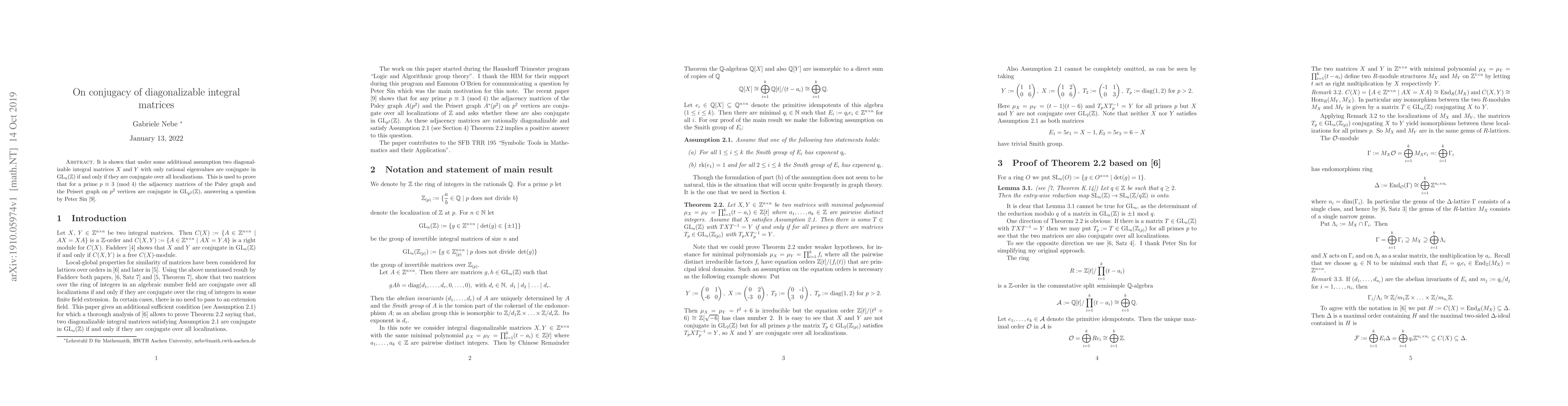 This paper demonstrates that two diagonalizable integral matrices with rational eigenvalues are conjugate in GL(n,Z) if and only if they are conjugate in all localizations. It applies this result to show that the adjacency matrices of the Paley and Peisert graphs on p^2 vertices are conjugate in GL(p^2,Z) for primes p congruent to 3 modulo 4.