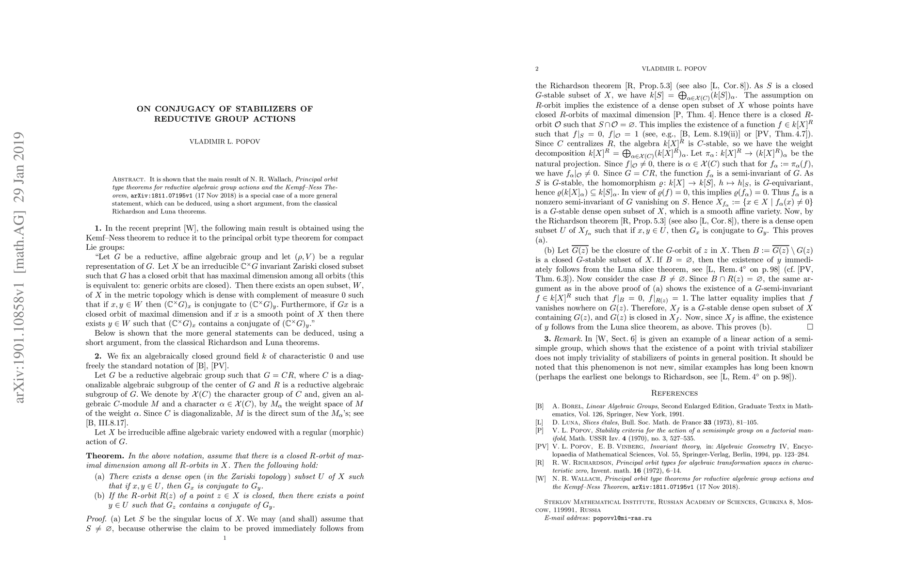 It is shown that the main result of N. R. Wallach, Principal orbit type theorems for reductive algebraic group actions and the Kempf--Ness Theorem, arXiv:1811.07195v1 (17 Nov 2018) is a special case of a more general statement, which can be deduced, using a short argument, from the classical Richardson and Luna theorems.