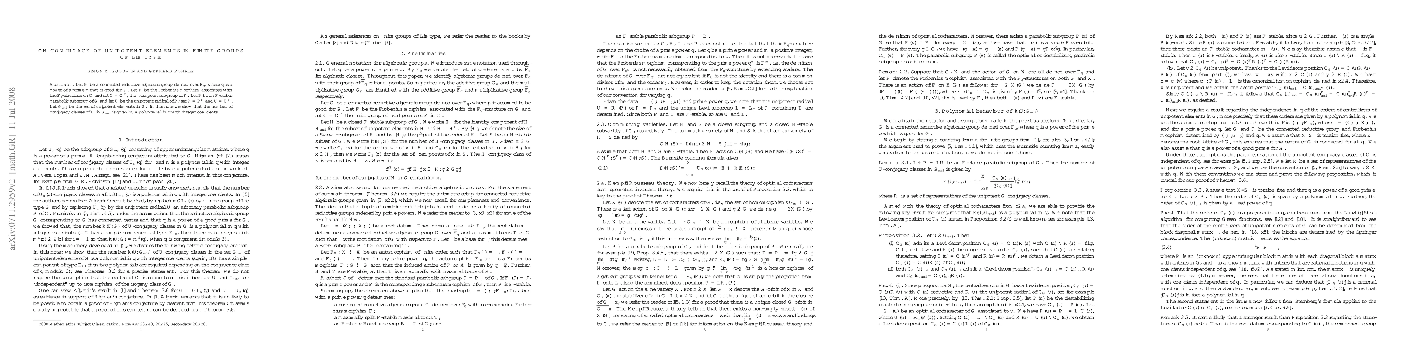 Let $\bfG$ be a connected reductive algebraic group defined over $\F_q$, where $q$ is a power of a prime $p$ that is good for $\bfG$. Let $F$ be the Frobenius morphism associated with the $\FF_q$-structure on $\bfG$ and set $G = \bfG^F$, the fixed point subgroup of $F$. Let $\bfP$ be an $F$-stable parabolic subgroup of $\bfG$ and let $\bfU$ be the unipotent radical of $\bfP$; set $P = \bfP^F$ and $U = \bfU^F$. Let $G_\uni$ be the set of unipotent elements in $G$. In this note we show that the number of conjugacy classes of $U$ in $G_\uni$ is given by a polynomial in $q$ with integer coefficients.