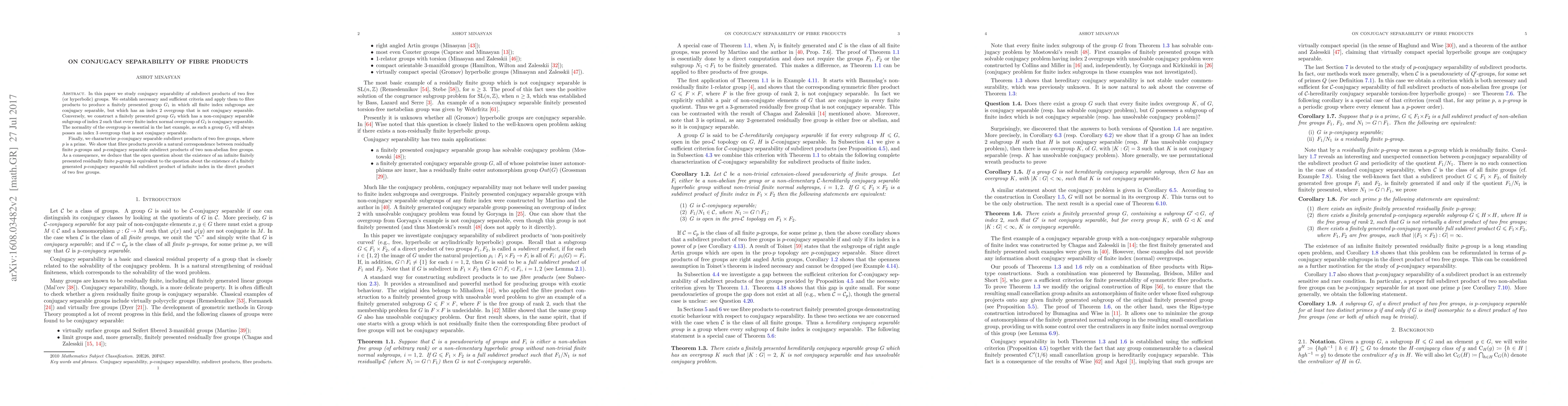 In this paper we study conjugacy separability of subdirect products of two free (or hyperbolic) groups. We establish necessary and sufficient criteria and apply them to fibre products to produce a finitely presented group $G_1$ in which all finite index subgroups are conjugacy separable, but which has an index $2$ overgroup that is not conjugacy separable. Conversely, we construct a finitely presented group $G_2$ which has a non-conjugacy separable subgroup of index $2$ such that every finite index normal overgroup of $G_2$ is conjugacy separable. The normality of the overgroup is essential in the last example, as such a group $G_2$ will always posses an index $3$ overgroup that is not conjugacy separable. Finally, we characterize $p$-conjugacy separable subdirect products of two free groups, where $p$ is a prime. We show that fibre products provide a natural correspondence between residually finite $p$-groups and $p$-conjugacy separable subdirect products of two non-abelian free groups. As a consequence, we deduce that the open question about the existence of an infinite finitely presented residually finite $p$-group is equivalent to the question about the existence of a finitely generated $p$-conjugacy separable full subdirect product of infinite index in the direct product of two free groups.