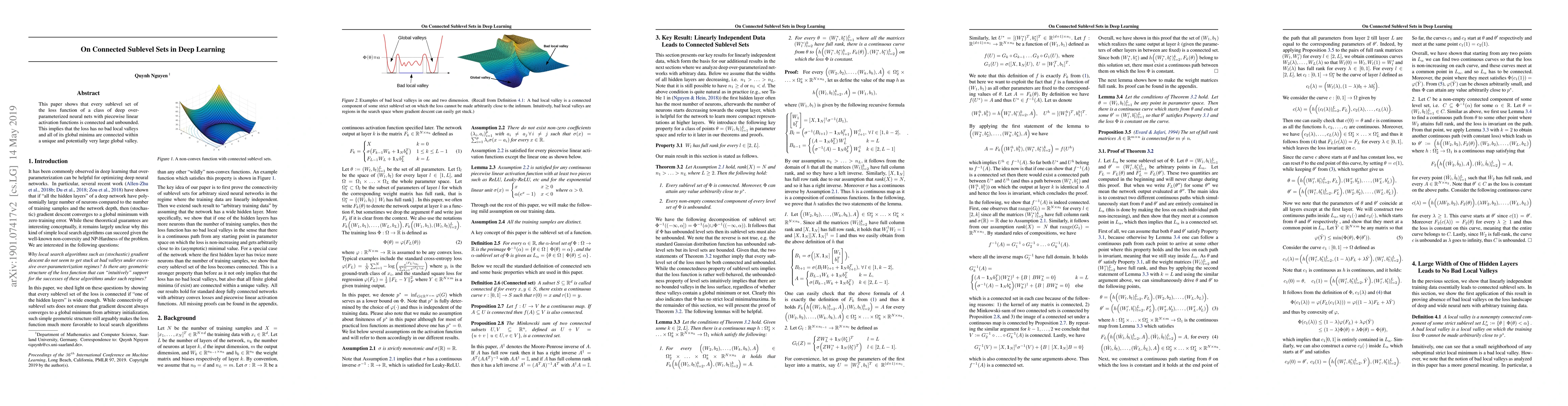 This paper demonstrates that sublevel sets of the loss function in deep over-parameterized neural networks with piecewise linear activations are both connected and unbounded, indicating no bad local minima and a single large global valley encompassing all global minima.